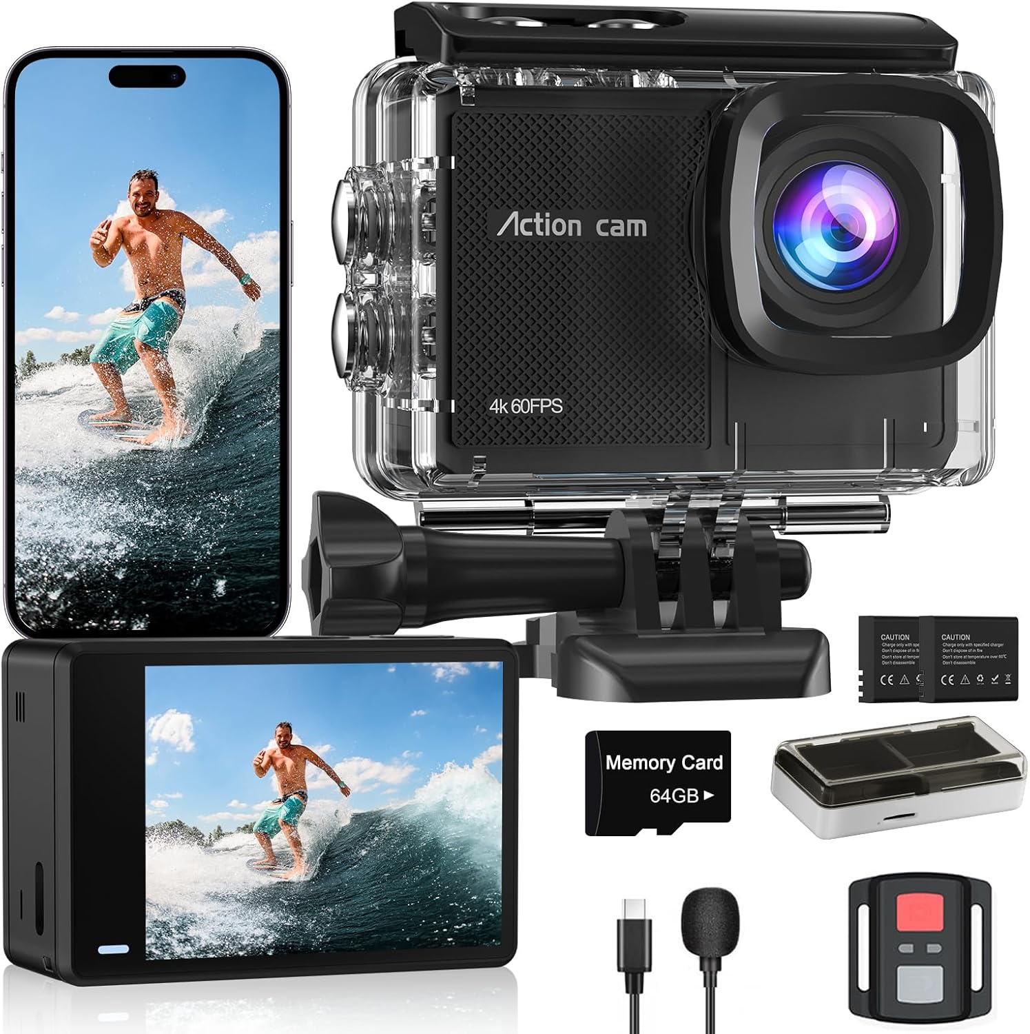 4K 60FPS Action Camera with 64GB Card-48MP Waterproof Camera,40M Underwater Camera,8X Zoom,EIS Stabilization,WiFi,Remote Control,MotorcycleCamera with 2 Rechargeable Batteries