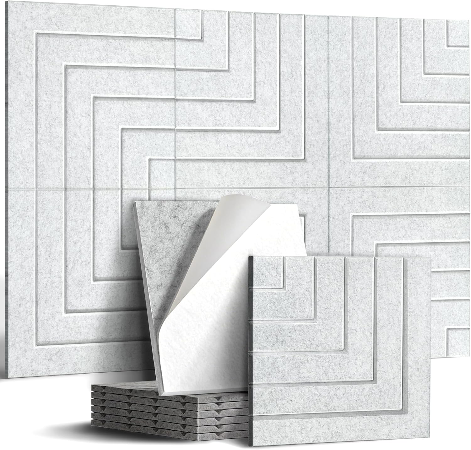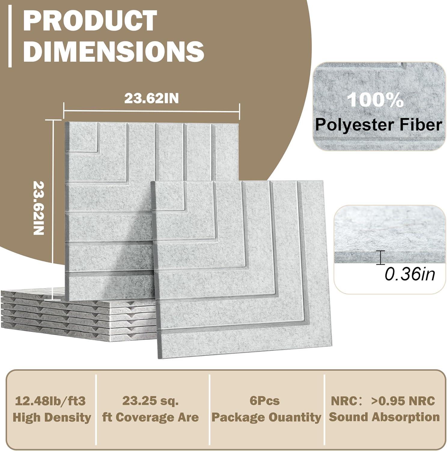 6 Pack Acoustic Panels, 23.6×23.6 Inch Sound Proof Panels for Walls,Self-Adhesive High-Density Decorative Sound Dampening Panels for Recording, Home, Media Room, Office and Studio, Gray