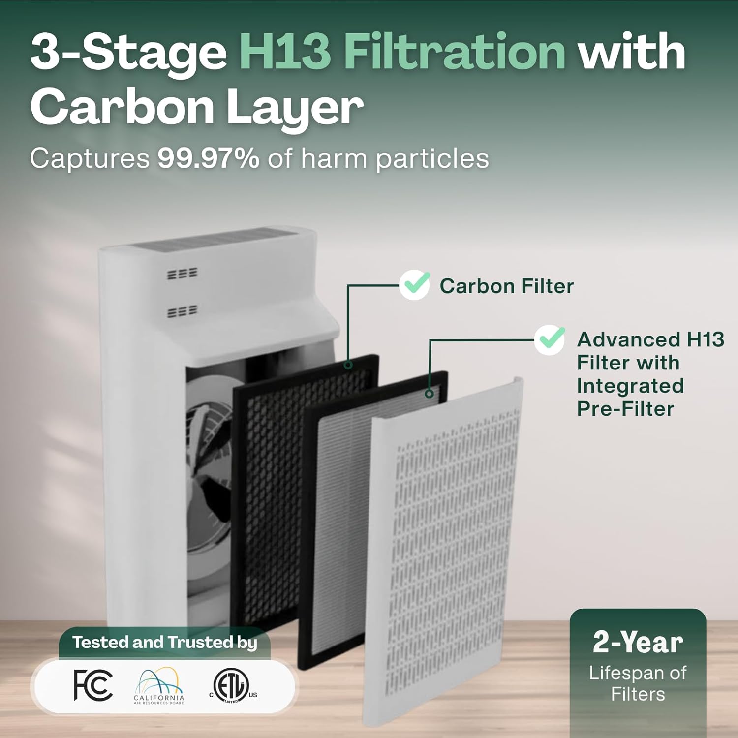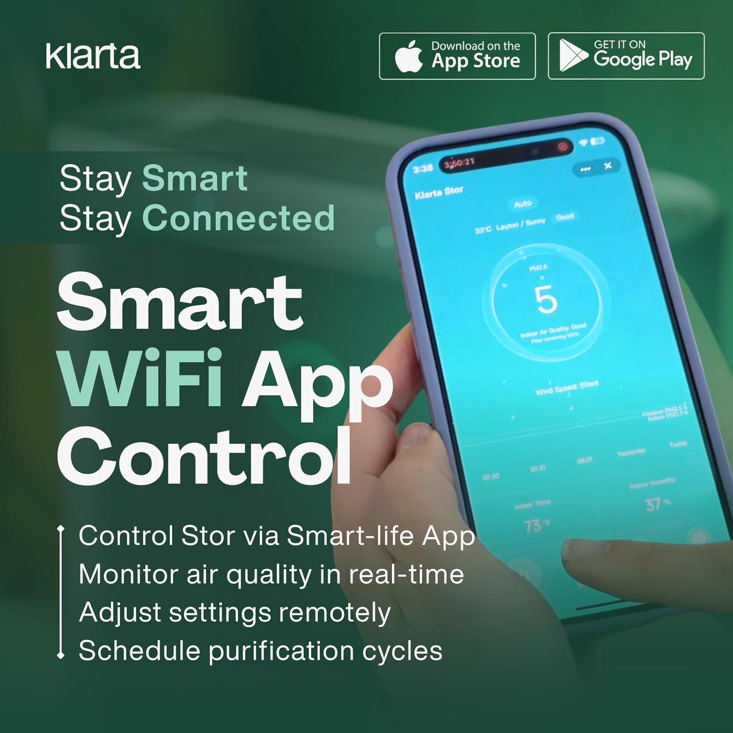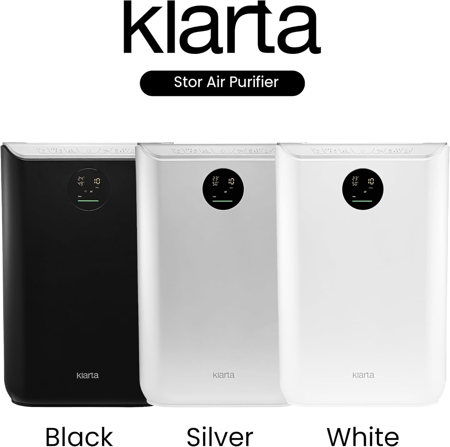 The Klarta Stor Air Purifier is designed for large rooms, covering areas up to 2775 square feet. This smart device connects to your WiFi, allowing for convenient control via an app. With an ultra-quiet operation at just 24 dB, it ensures a peaceful environment while effectively removing allergens, smoke, and pet odors. The air purifier features a 99.97% particle filtration system, making it a reliable choice for maintaining clean air.