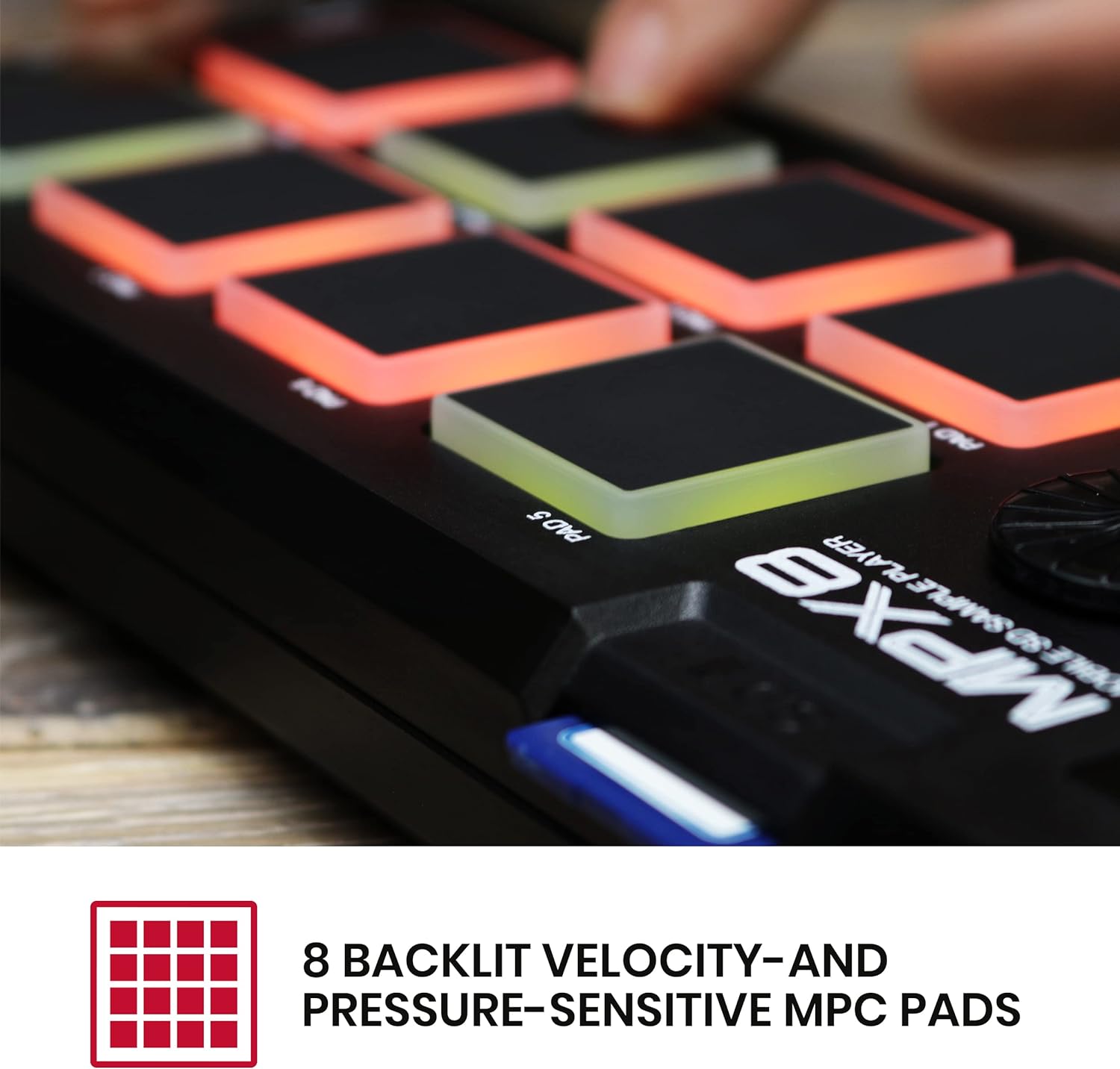 The Akai Professional MPX8 is a portable sample pad controller featuring eight velocity- and pressure-sensitive pads, MIDI connectivity, and an on-board SD card slot for triggering sound samples.
