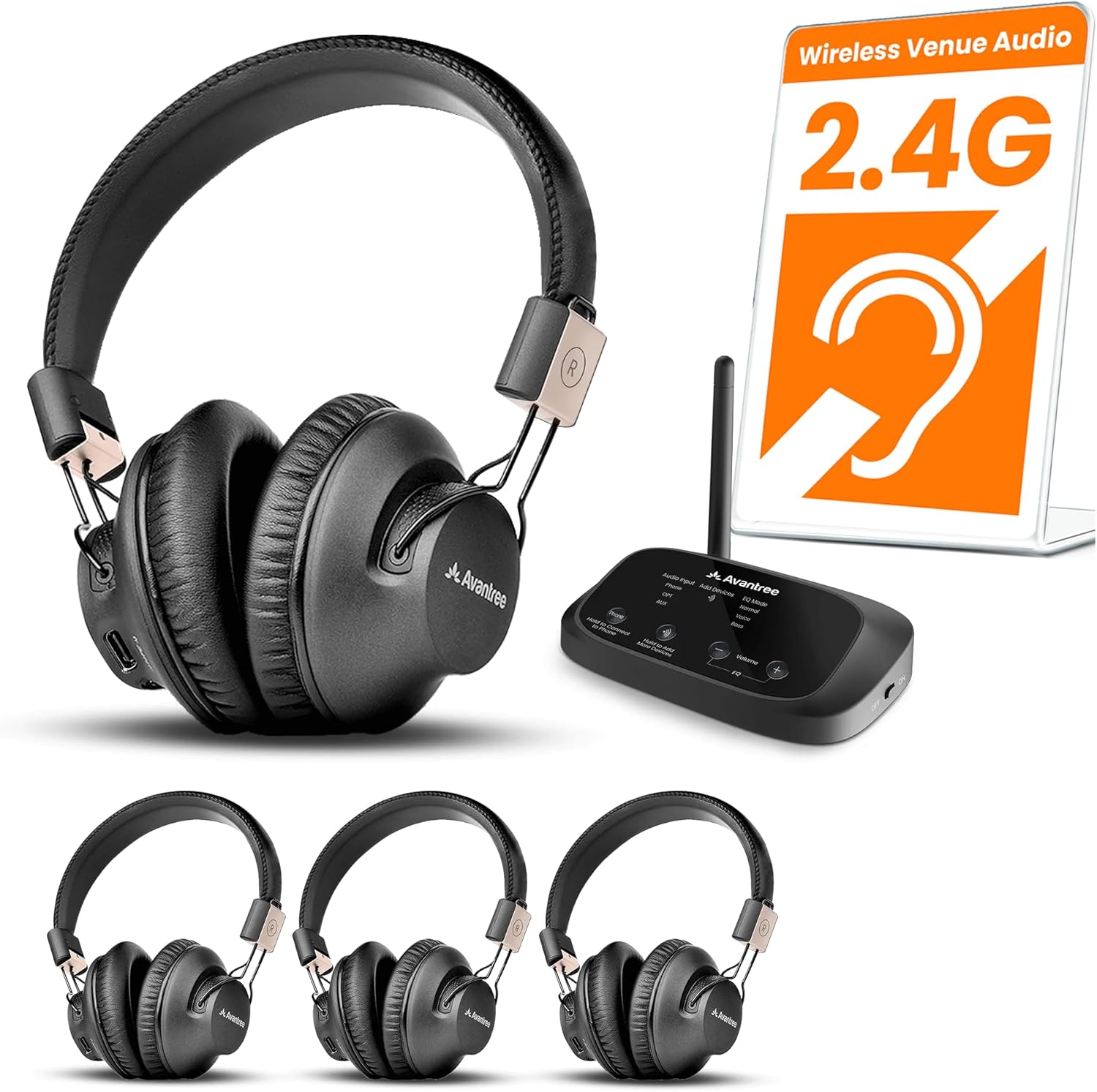 Avantree Quartet 2 – Wireless Group Listening Headphones & Transmitter for TV, Church, Classroom, Silent Discos, Plug & Play, 2.4GHz Expandable Multi-Headphone System with Low Latency & Clear Voice