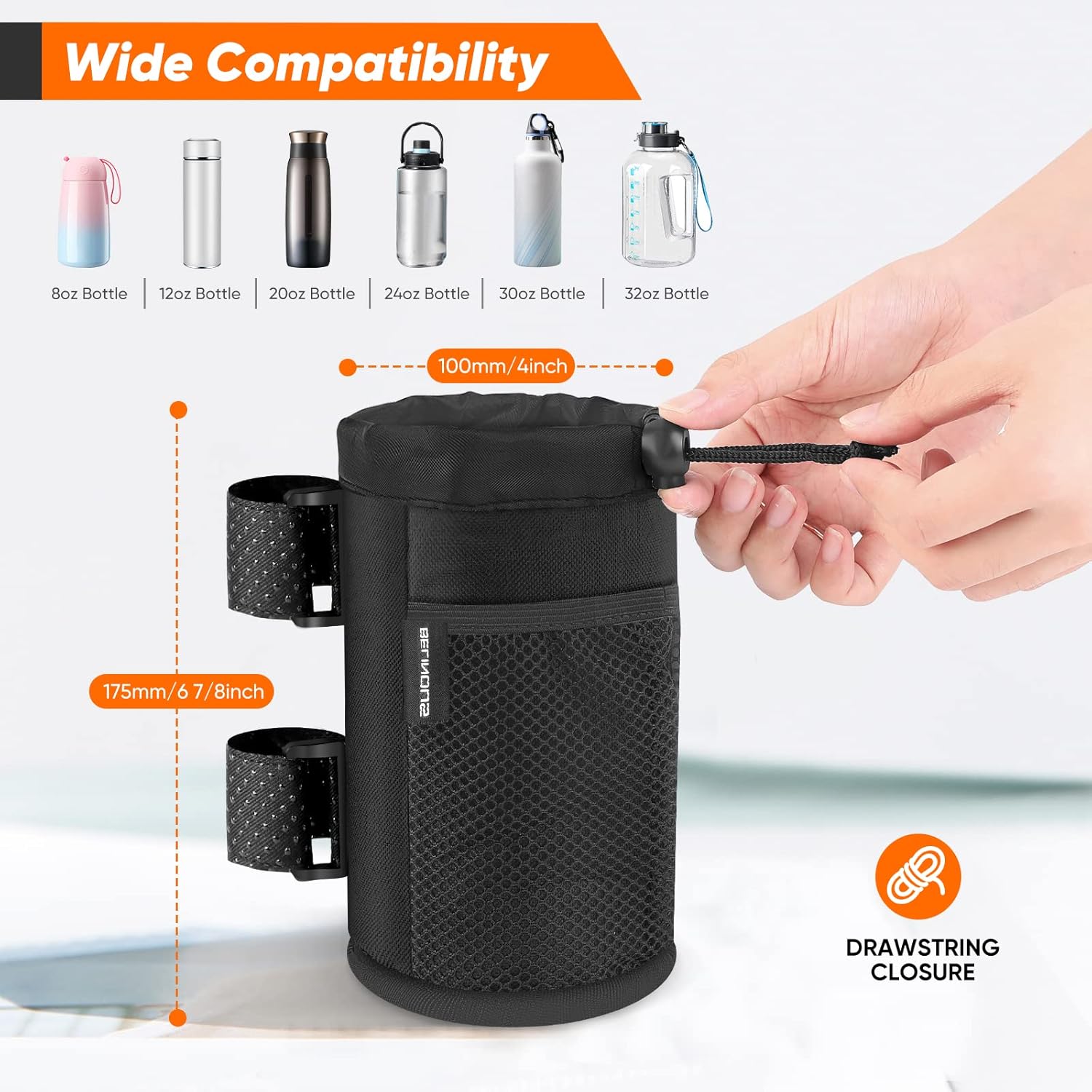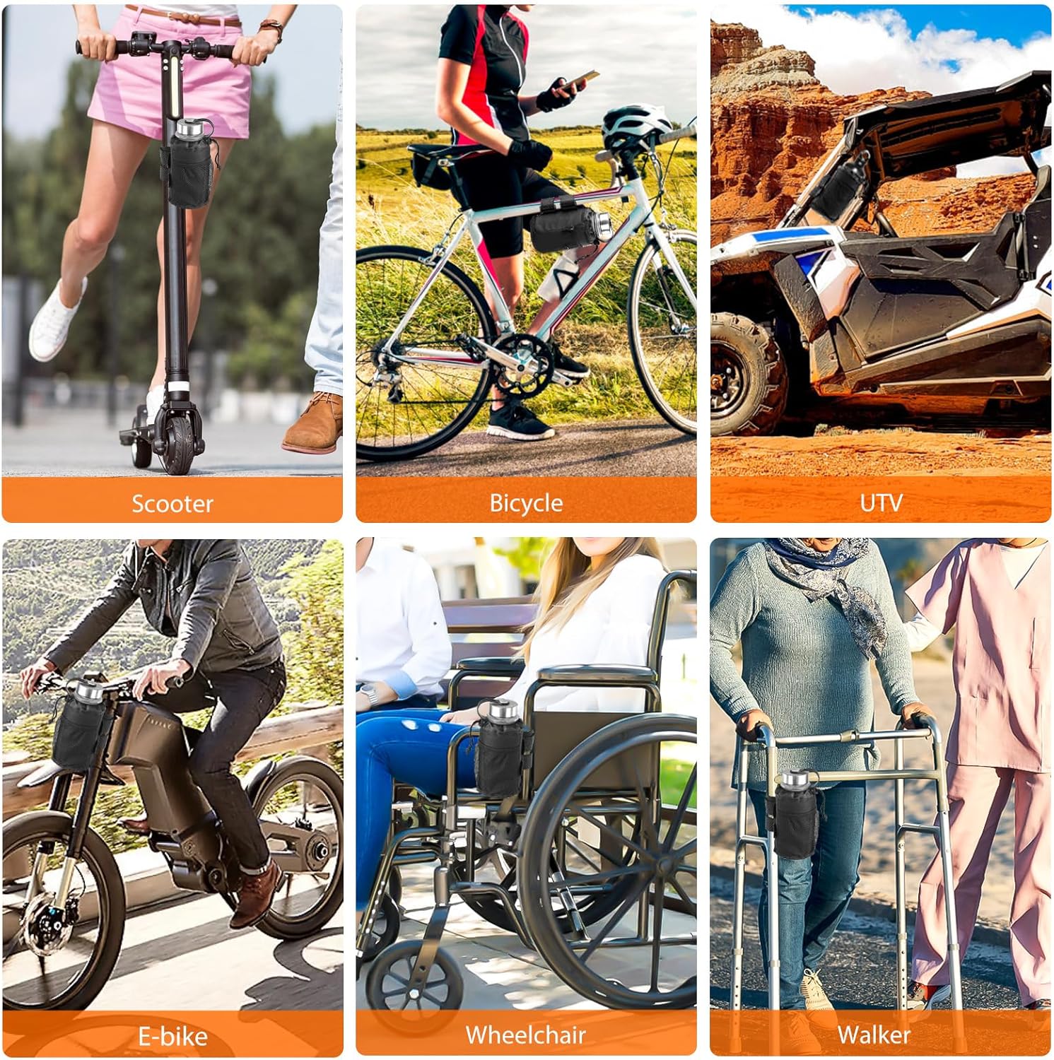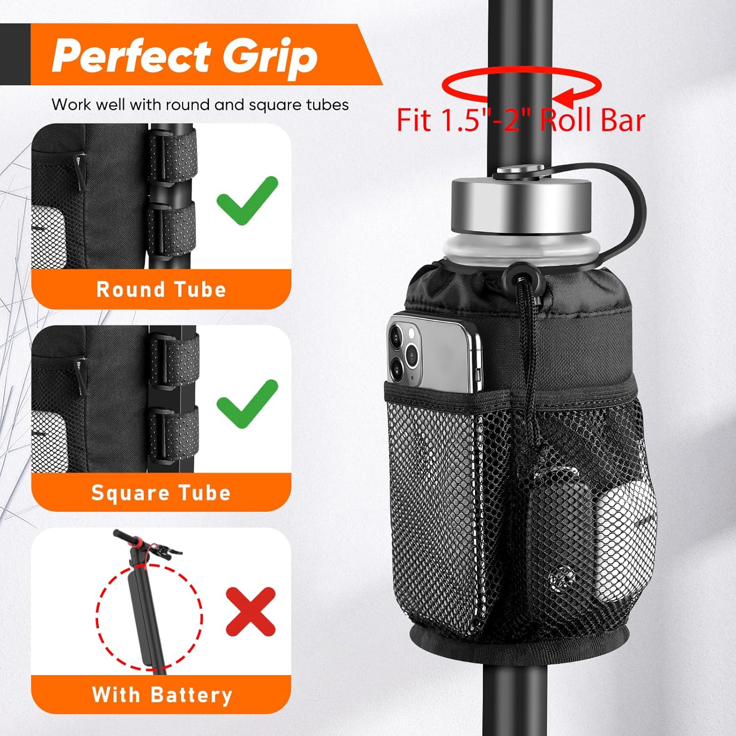 Belinous Scooter Cup Holder for 8-32oz Bottles, Wheelchair Walker Water Bottle Holder for UTV Roll Bar Bike e-Bike Golf Cart and Boat, Drink Holder with Net Pockets and Hook and Loop Straps