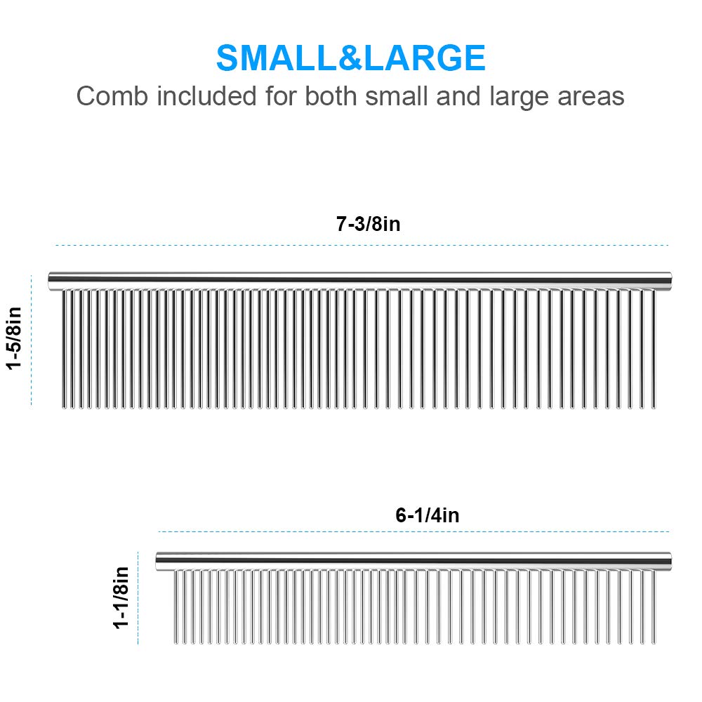 The Cafhelp 2 Pack Dog Combs are designed with rounded ends and stainless steel teeth, making them suitable for both dogs and cats. These professional grooming tools are effective for removing tangles and knots from long and short-haired pets. Each comb measures 6.3 inches and 7.4 inches, providing options for different grooming needs.