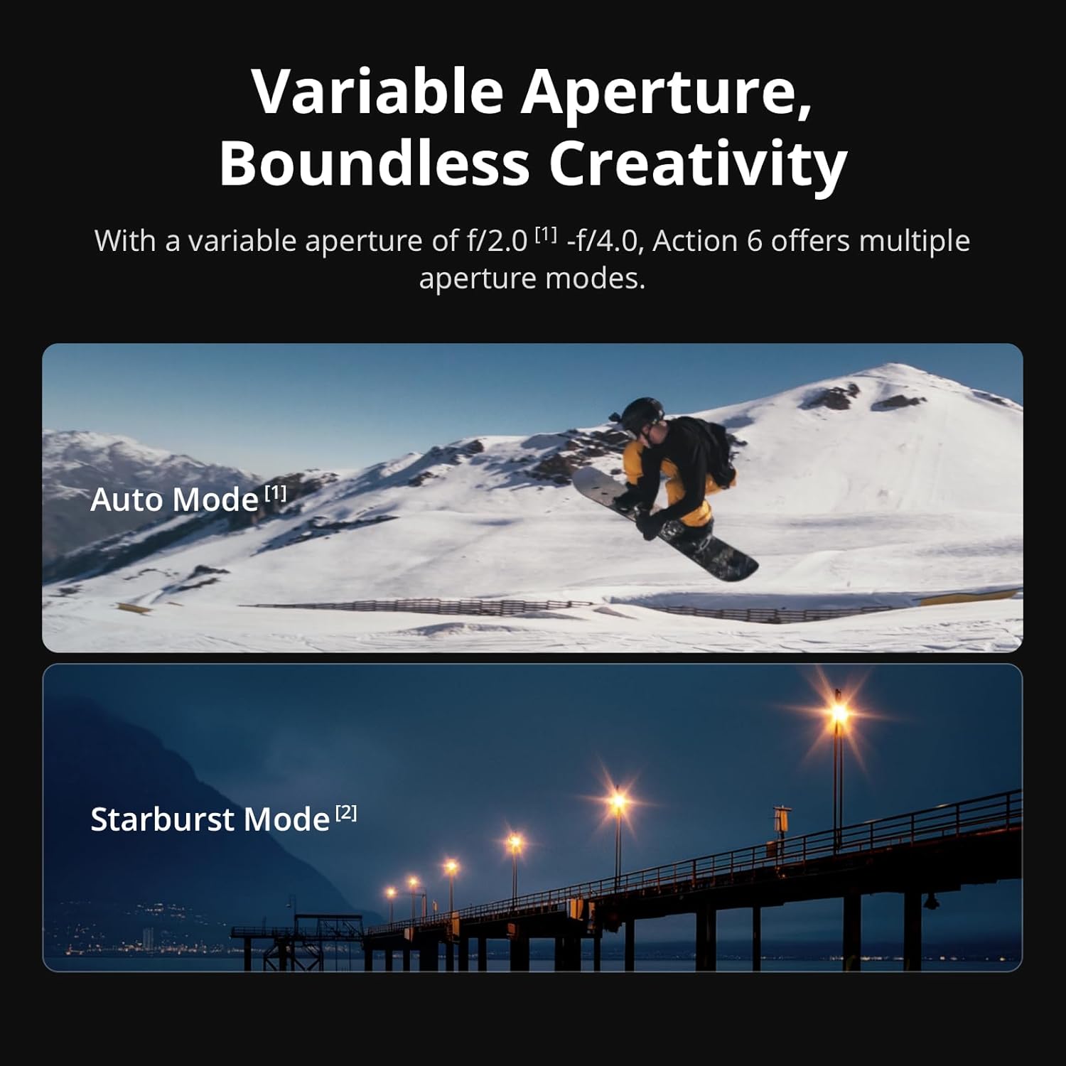 The DJI Osmo Action 6 features a variable aperture range of f/2.0 to f/4.0.