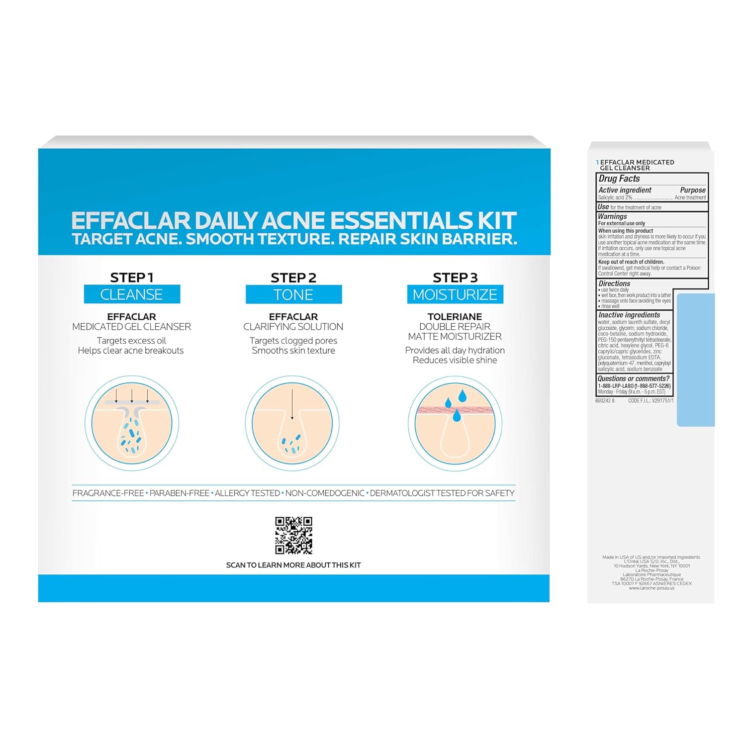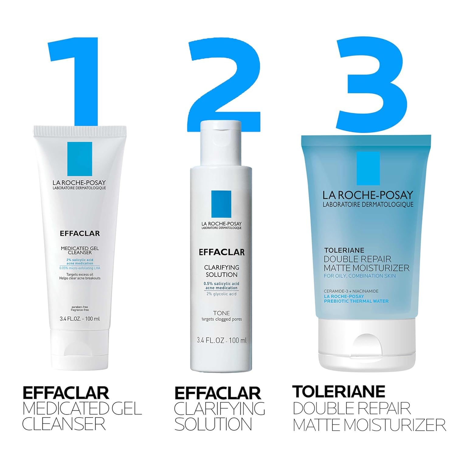 Effaclar Daily Acne Essentials Kit, Acne Treatment System, Salicylic Acid Acne Cleanser, Pore Refining Toner, & Matte Face Moisturizer for Oily Skin & Combination Skin, Oil-Free, 2 Month Supply