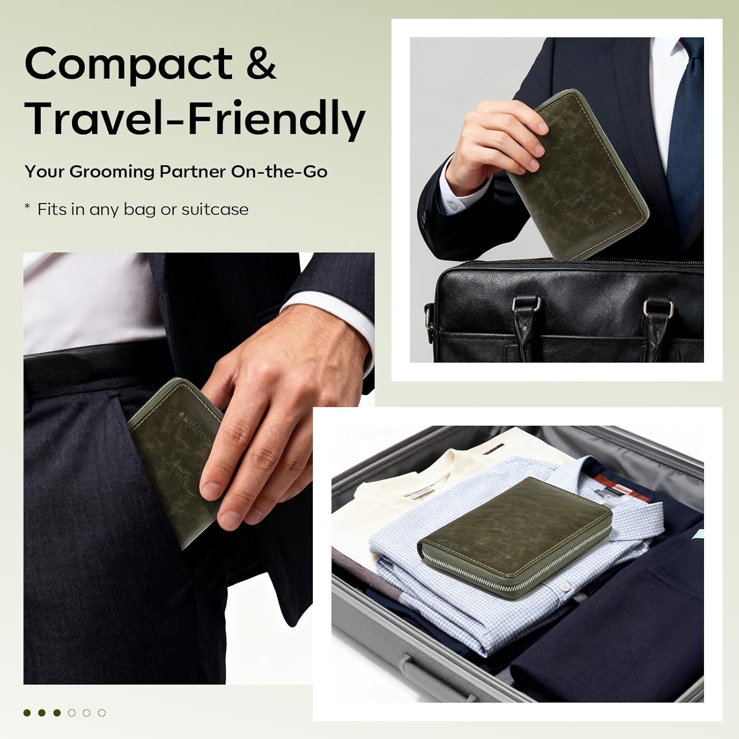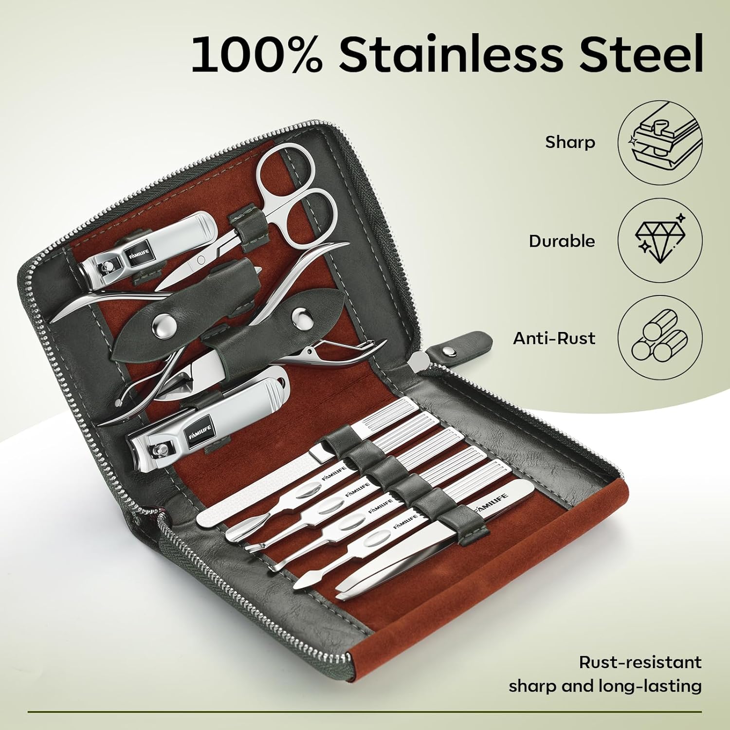 The FAMILIFE Manicure Set is a comprehensive 11-in-1 grooming kit designed for both men and women. Made from high-quality stainless steel, this set includes essential tools for nail care and grooming. The portable green leather travel case makes it easy to carry, ensuring you can maintain your nails on the go.