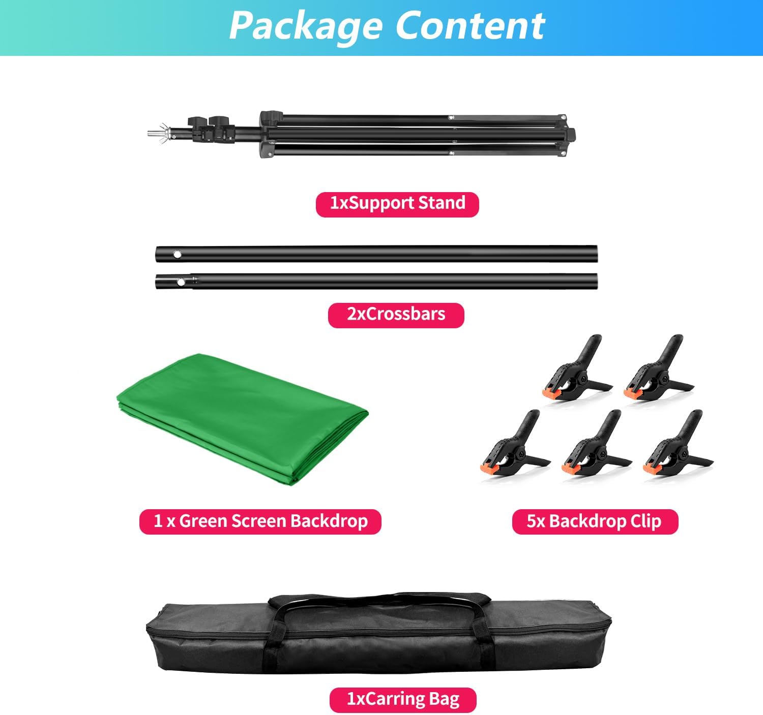 The kit includes a green screen backdrop, a stand, clamps, and a carrying bag.
