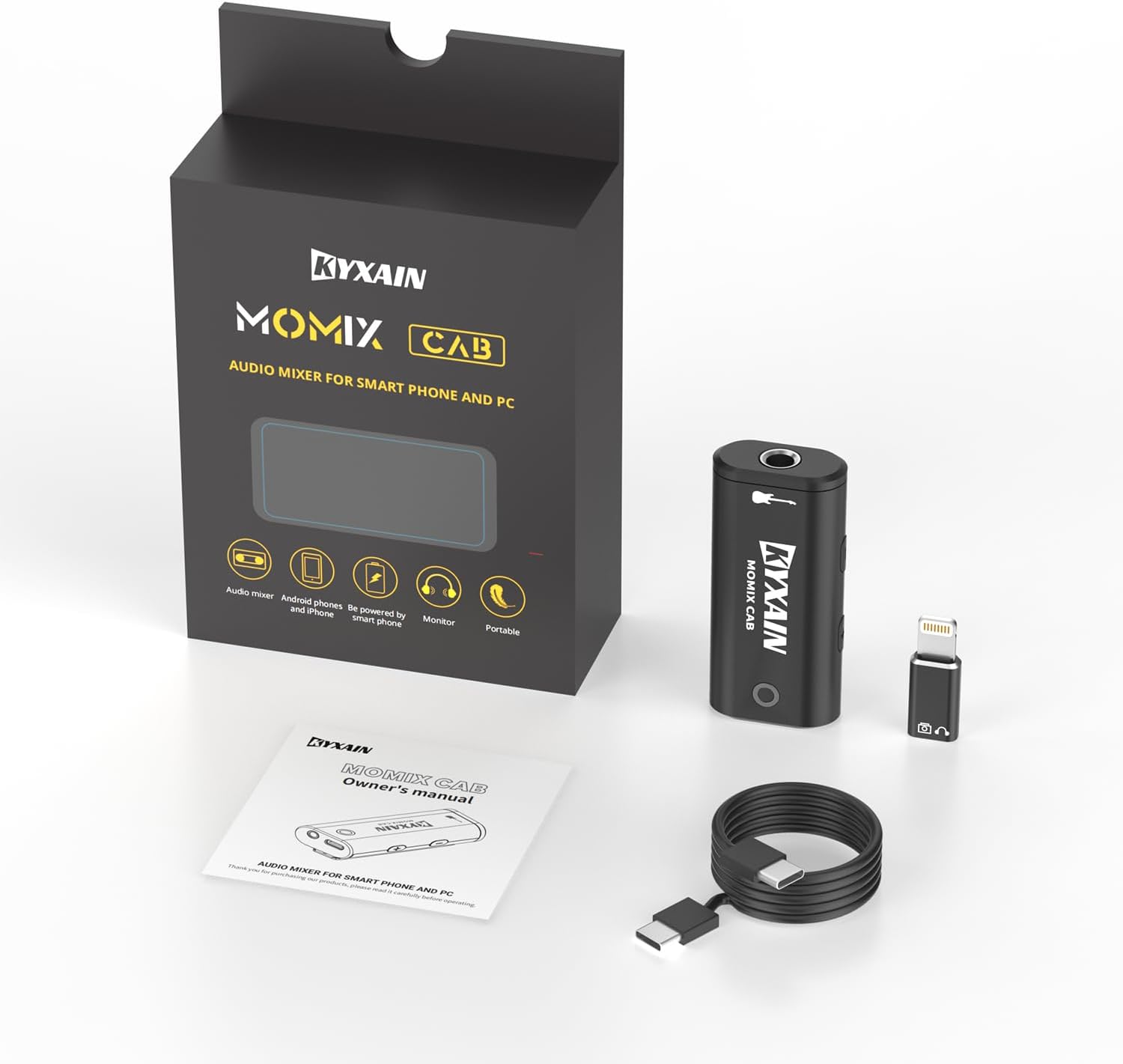 The KYXAIN MOMIX CAB is a compact audio mixer designed for use with smartphones and PCs, making it perfect for recording and live streaming on the go. Its portable size allows you to easily carry it in your pocket. The device connects to your smartphone via USB, enabling you to record and stream audio directly from your guitar or headphones. With high-quality audio output, it is suitable for various applications, including songwriting, webcasts, karaoke, and live performances.