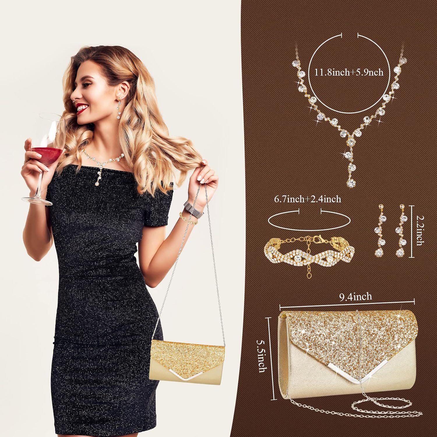Henoyso 5 Pcs Purse Rhinestone Jewelry Set Prom Jewelry Rhinestone Clutch Purse Necklace Earrings Bracelets for Women Bride