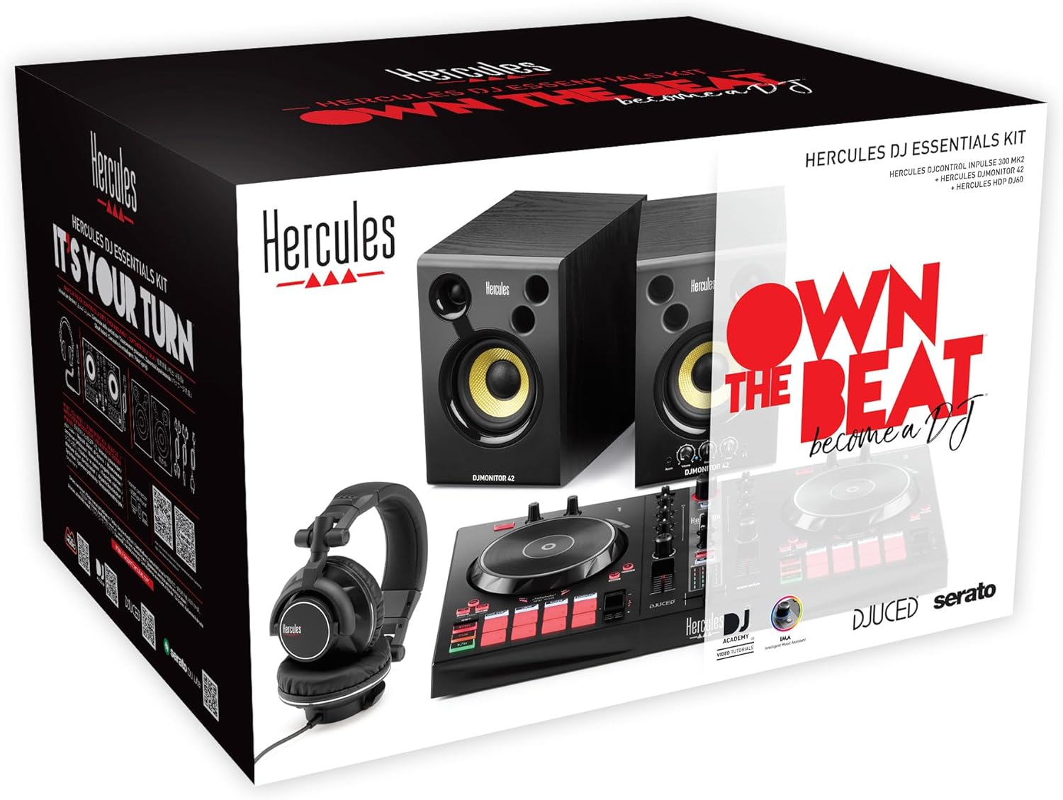 The kit includes the Hercules DJControl Inpulse 300 MK2, DJMonitor 42 speakers, HDP DJ60 headphones, and access to DJUCED and Serato DJ Lite software.