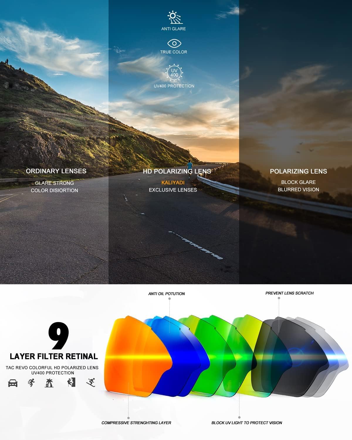 - Polarized lenses reduce glare