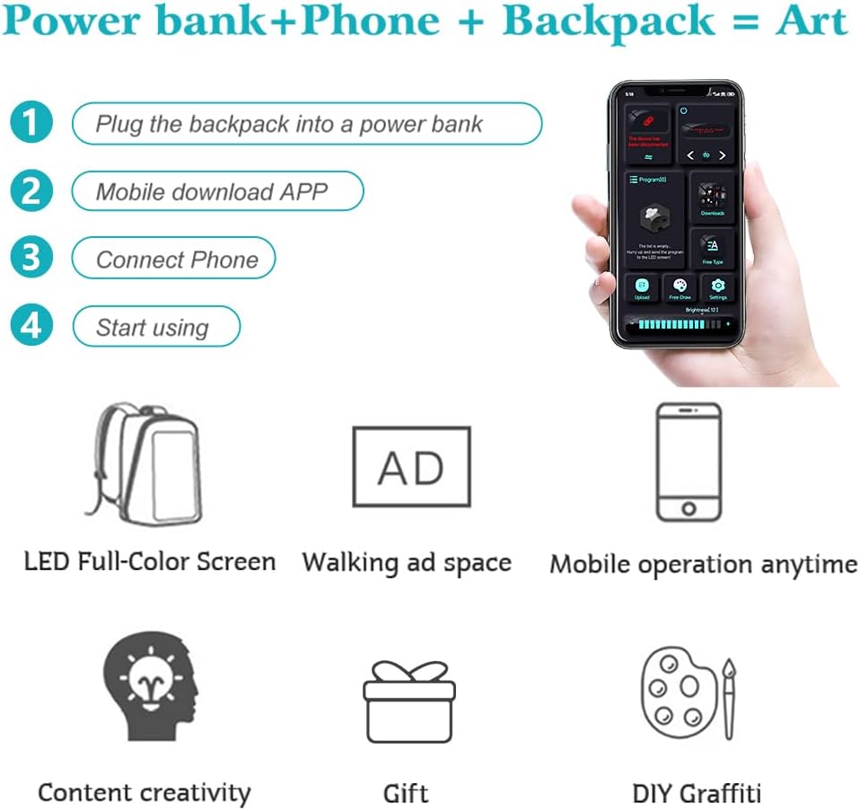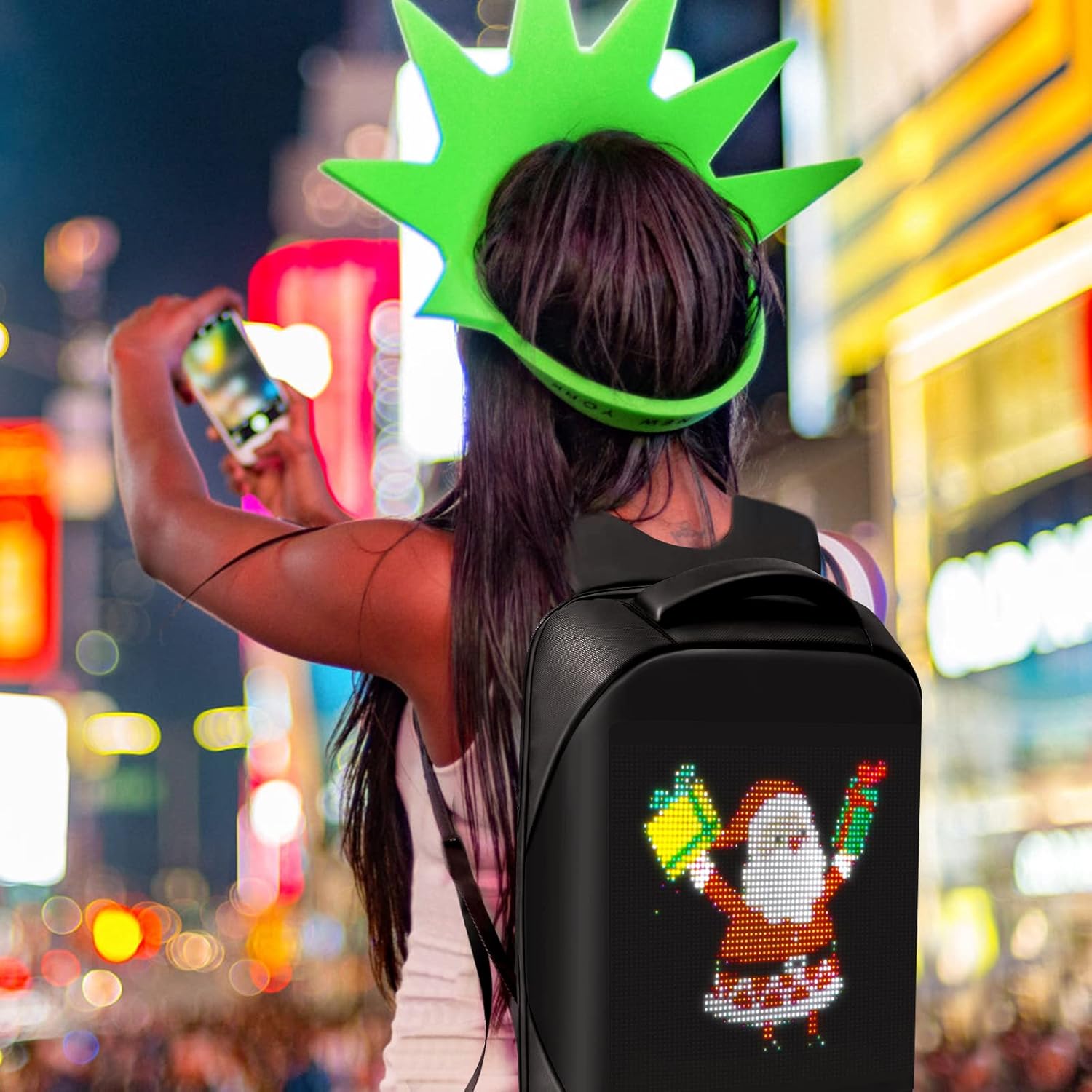 The Laptop Backpack with Programmable Screen is designed for both functionality and style. This unique backpack features an app-controlled LED display, allowing users to customize messages or designs. Its waterproof material ensures that your belongings stay dry during travel or outdoor activities. With ample space, it can accommodate a 15.6-inch laptop along with additional items like clothes, an umbrella, and a water bottle. This makes it an ideal choice for travel, motorcycle rides, or as a unique gift for both men and women.