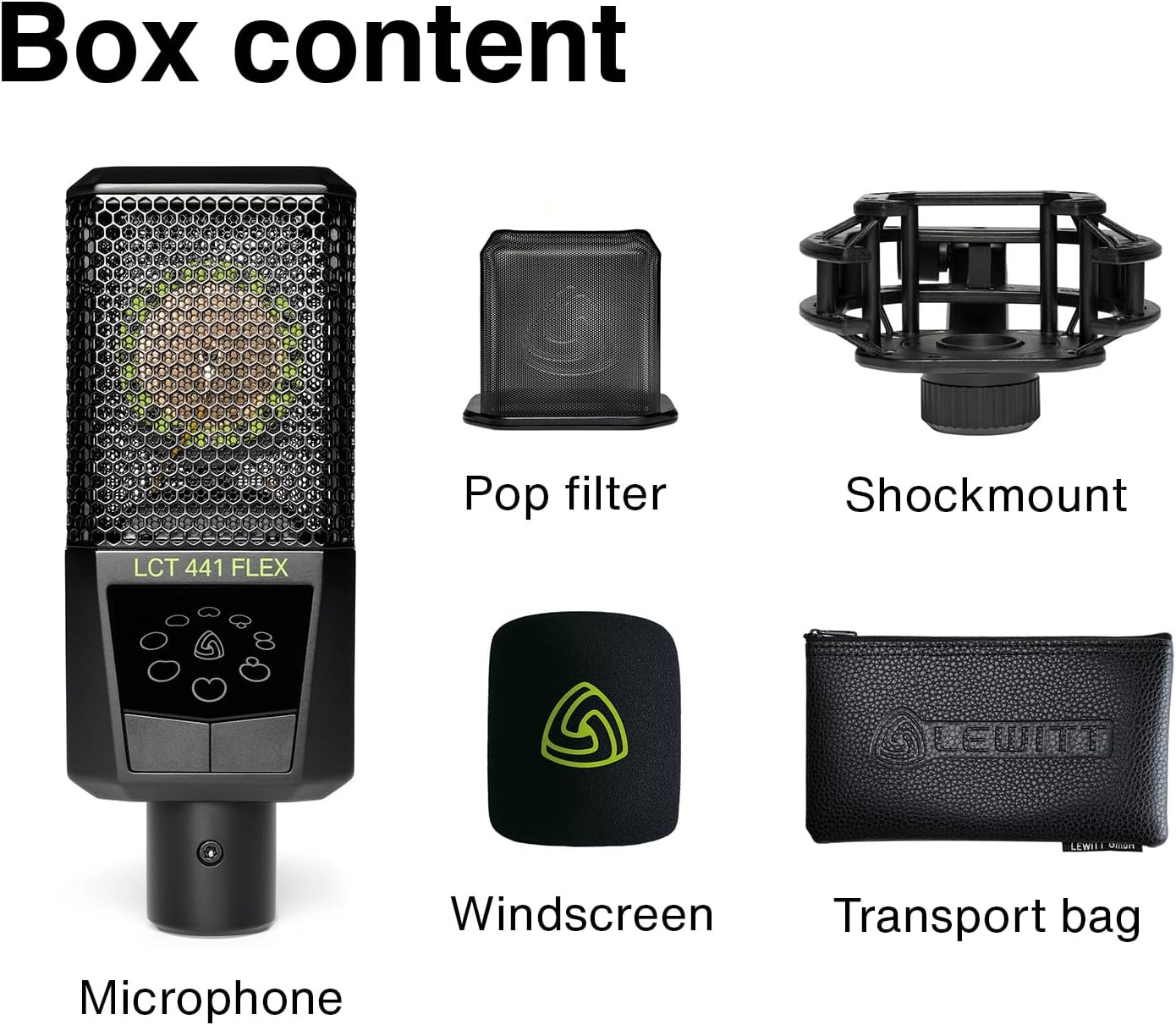 The LEWITT LCT 441 FLEX is a versatile multi-pattern studio microphone designed for professional audio recording. This 1" true condenser microphone features eight selectable directionality patterns, including three reverse polar patterns for enhanced flexibility. It is ideal for various recording scenarios, allowing users to experiment with sound capture. The microphone comes equipped with essential accessories such as a shock mount, windscreen, and pop filter, ensuring optimal performance in different environments.