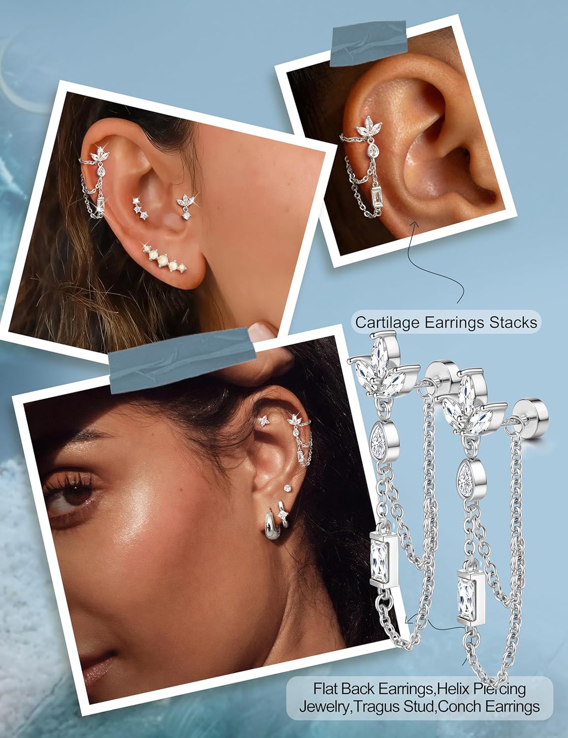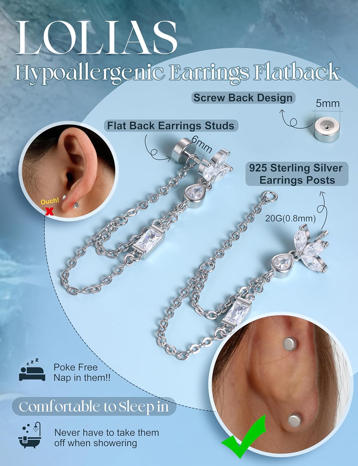 The LOLIAS Hypoallergenic Cartilage Earrings are designed specifically for women with sensitive ears. Made from 925 sterling silver, these flat back earrings are perfect for various piercings, including cartilage, tragus, conch, and helix. Their 20G size ensures a comfortable fit, while the flatback design minimizes irritation.
