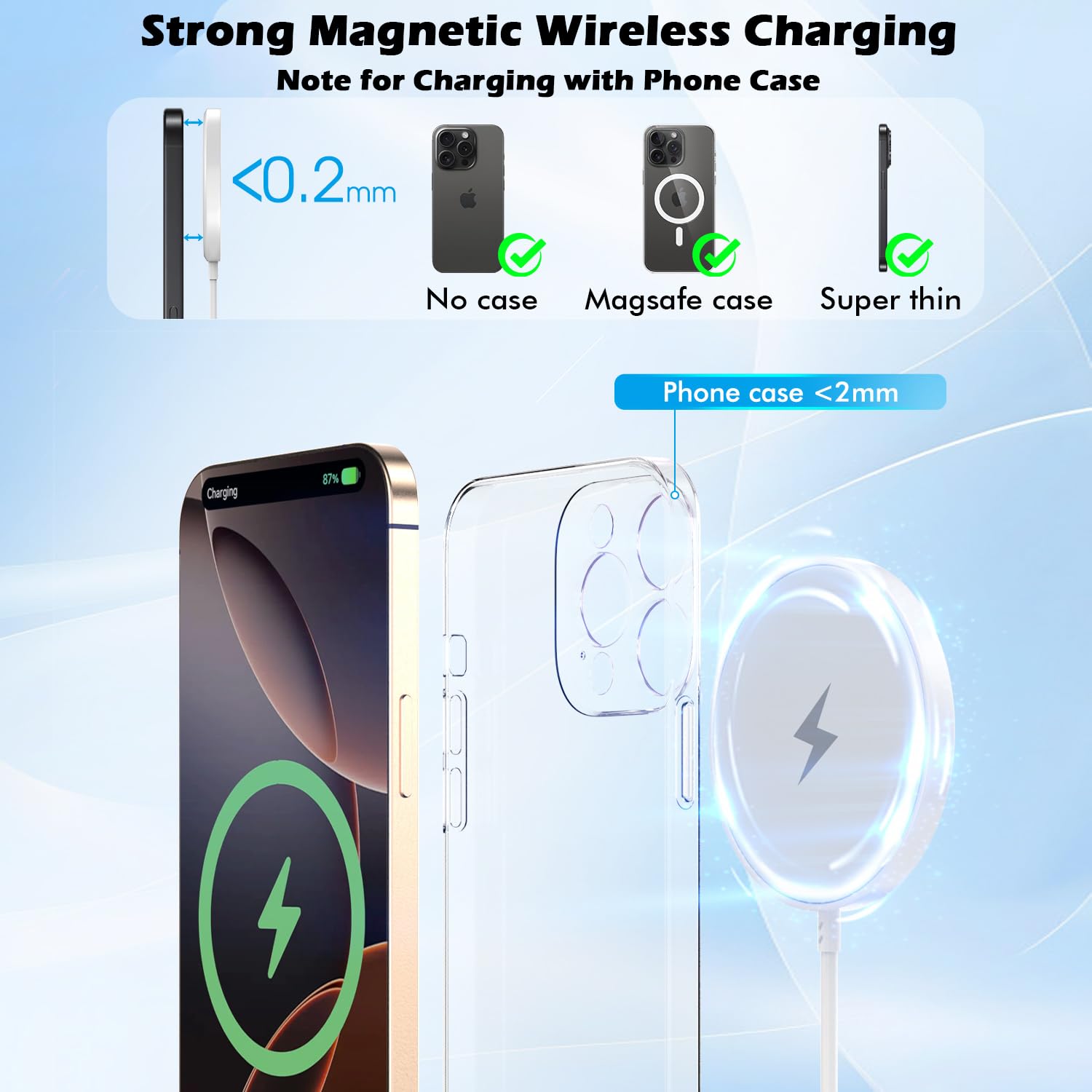 The Magnetic Charger for iPhone 17 offers fast and efficient wireless charging capabilities. With support for 5W, 7.5W, 10W, and a maximum of 15W, it can charge your device significantly faster than standard chargers. The charger features a powerful 6-foot magnetic design that ensures proper alignment for optimal charging. This allows you to use your device comfortably while it charges, whether at home, in the office, or in your car.