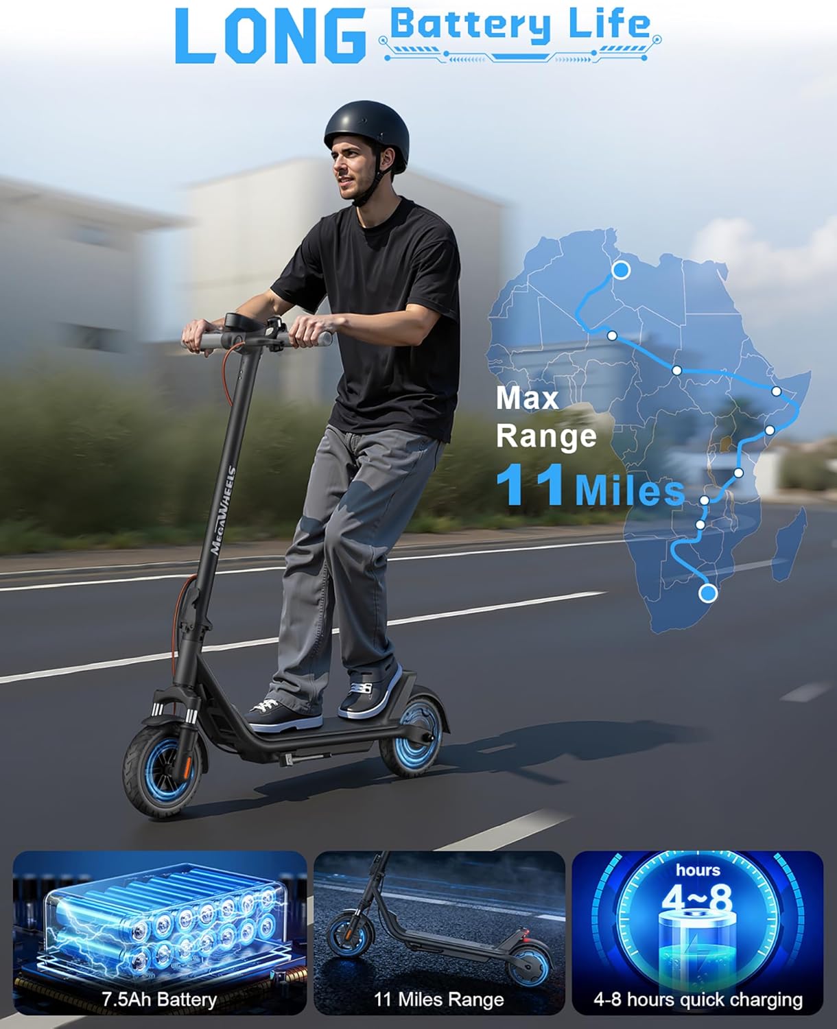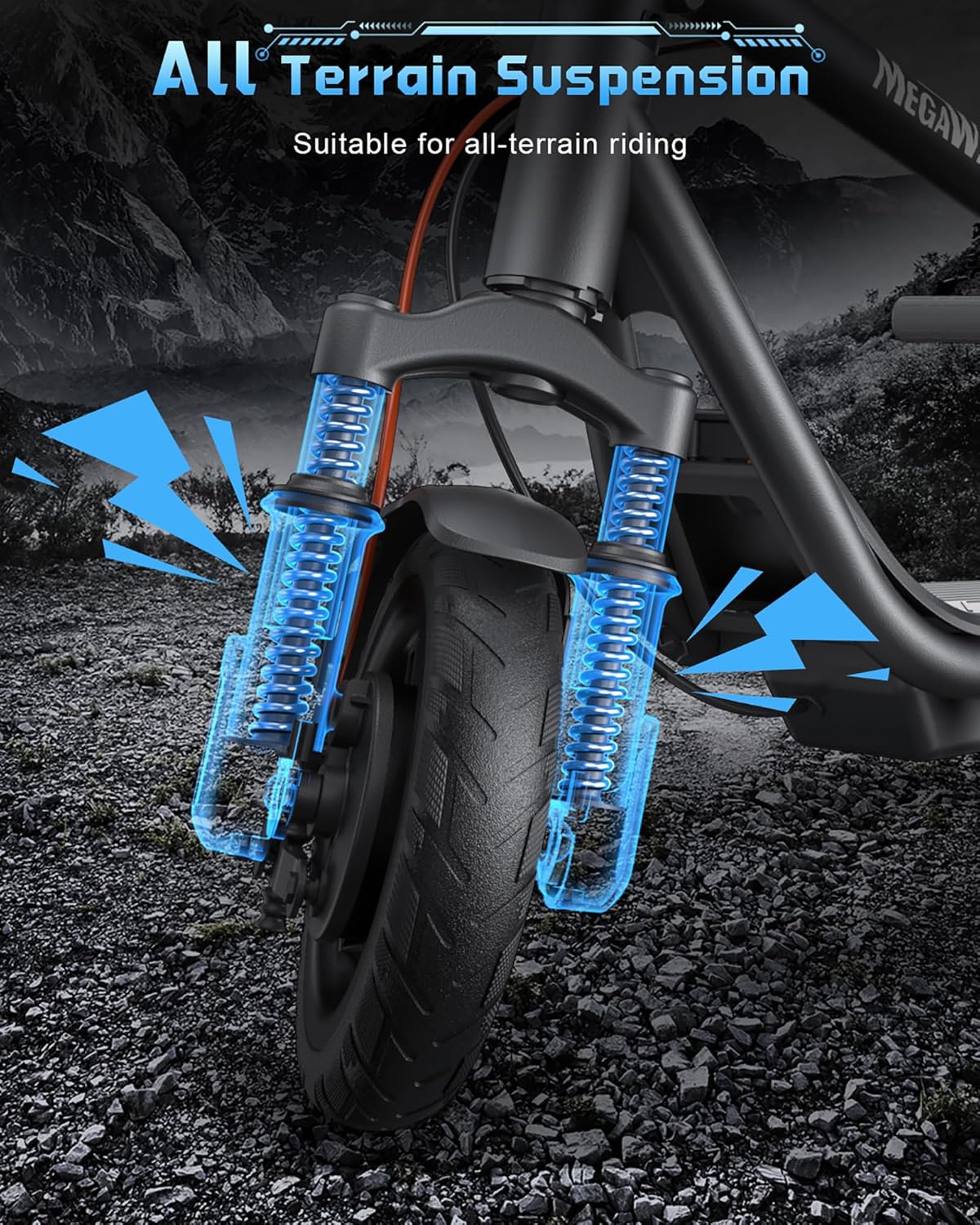 The MEGAWHEELS Electric Scooter is designed for adults seeking reliable daily transport. It features a dual front suspension system that enhances comfort on various terrains, ensuring a stable ride. With a top speed of 15 MPH and a range of up to 31 miles, it is suitable for both commuting and leisure rides. The scooter is equipped with a 300W motor for quick acceleration and a 7500mAh battery for extended use.