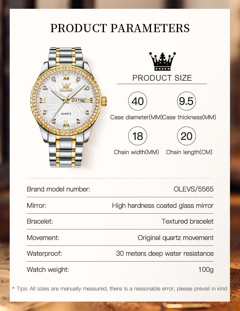 The OLEVS Mens Watches Chronograph is a stylish and functional timepiece designed for both business and casual wear. Made with durable stainless steel, this watch is not only elegant but also waterproof, making it suitable for various occasions. The luminous features allow for easy readability in low-light conditions, adding to its practicality.