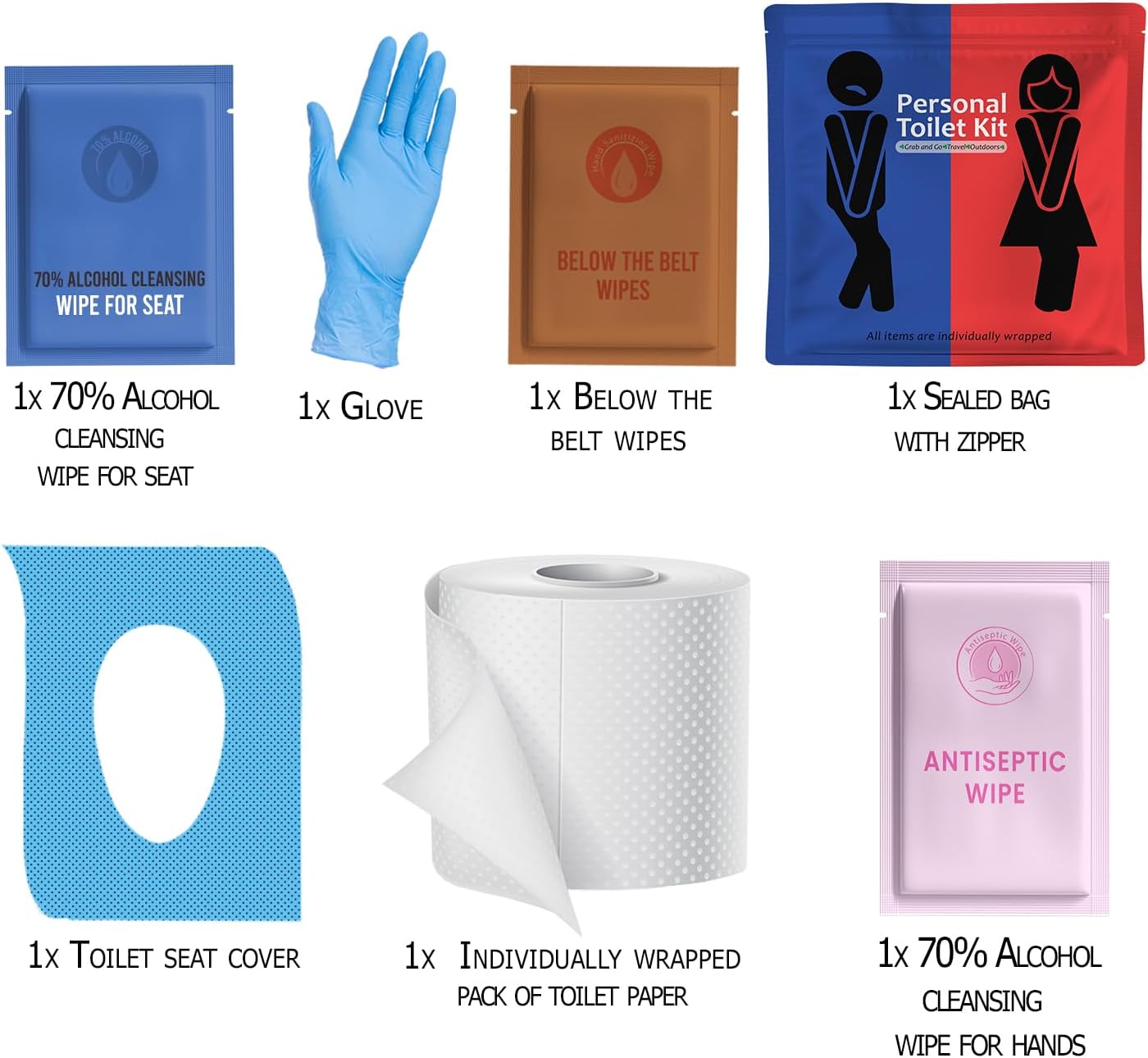 Each kit includes 1 glove, 1 toilet seat cleansing wipe, 1 toilet seat cover, 1 packet of individually wrapped toilet paper, 2 below the belt wipes, and 1 70% alcohol hand cleansing wipe.