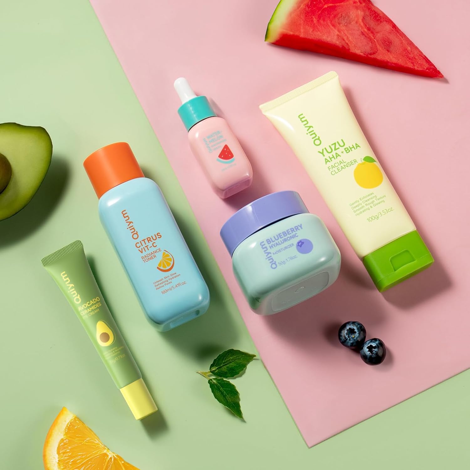 QUIYUM Fruit Skincare for Teens, 5 Daily Routine Beauty Skin Care Sets – Exfoliating, Smooth, Clean, Oil Control, Firm, Hydrating, Glow Up, Facial Skincare Gift Set for Girls Women, for All Skin Types