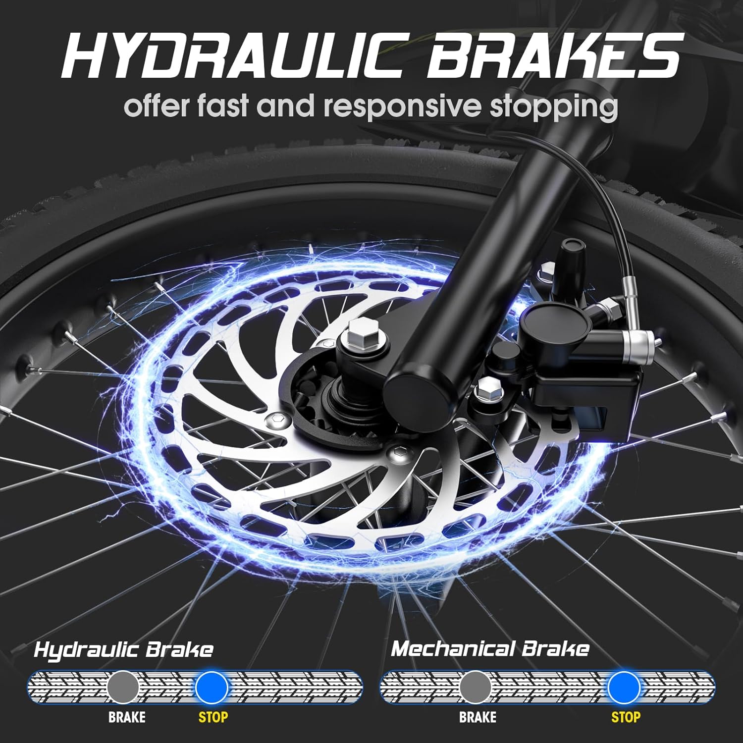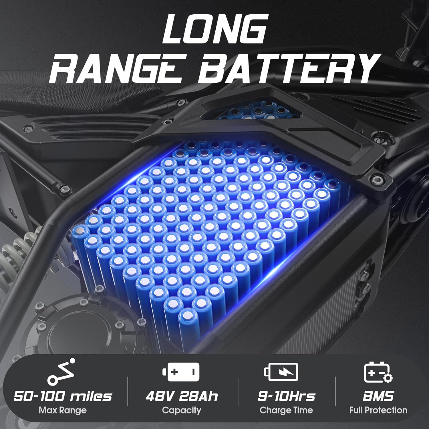 The Seemoon Electric Dirt Bike is designed for both teens and adults, featuring a powerful 3200W mid-drive motor that allows for speeds up to 32MPH. This bike is equipped with a 48V 28Ah removable battery, providing a range of up to 80 miles on a single charge. The 17" fat tires and full suspension system enhance stability and comfort on various terrains. Additionally, the hydraulic brakes ensure reliable stopping power for safe rides.
