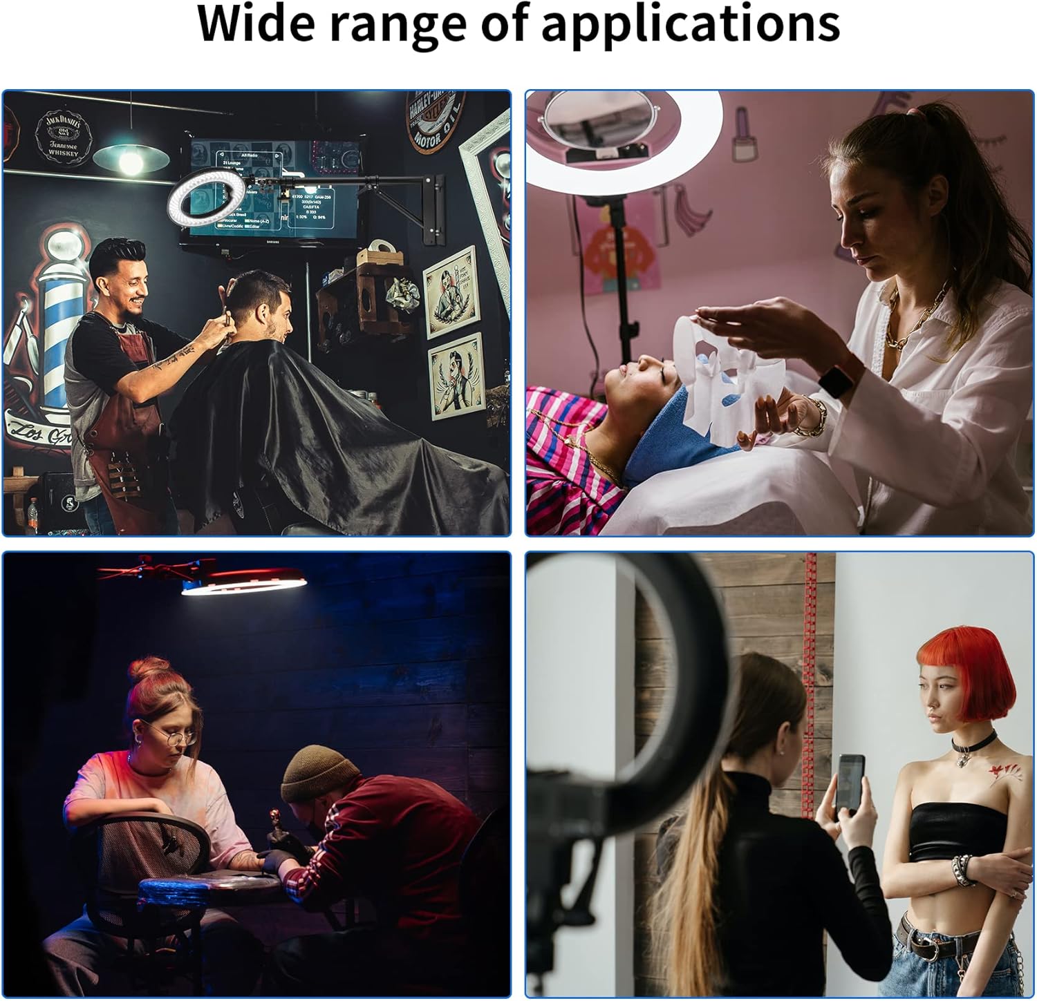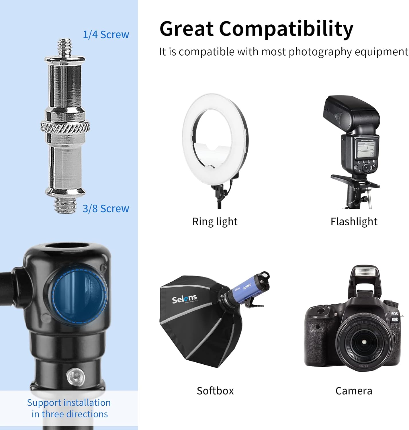 The boom arm is compatible with ring lights, strobe lights, flash lights, softboxes, reflectors, DSLR cameras, and microphones.