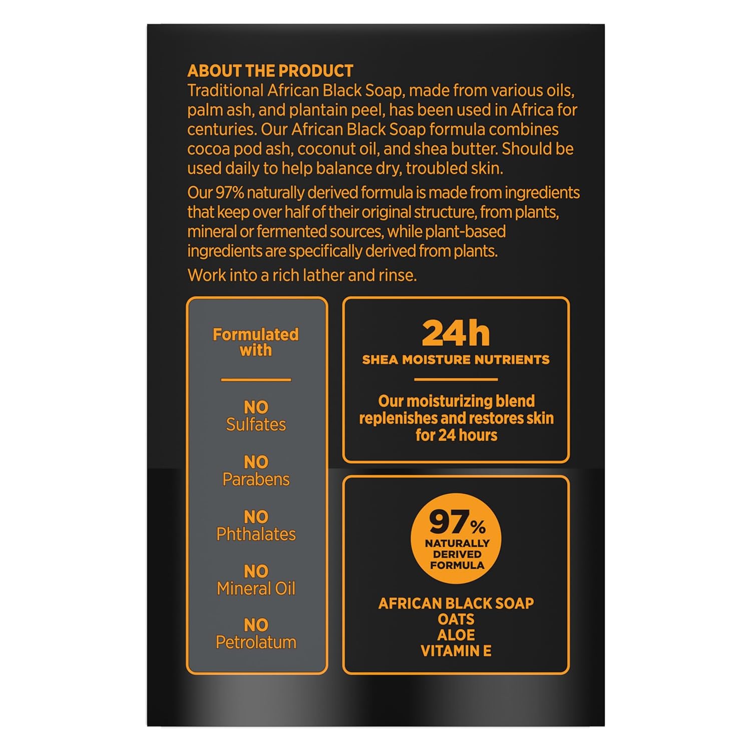 The SheaMoisture African Black Soap is specially formulated for melanin-rich skin. Infused with natural ingredients like African Black Soap, Oats, Aloe, and Vitamin E, this bar soap gently cleanses while helping to balance dry and troubled skin. It leaves your skin feeling calm, smooth, and moisturized for up to 24 hours. Made with fair trade Shea Butter, it utilizes innovative Shea Emulsion technology for even coverage. This product is 92% naturally derived and free from harmful additives such as sulfates and parabens.