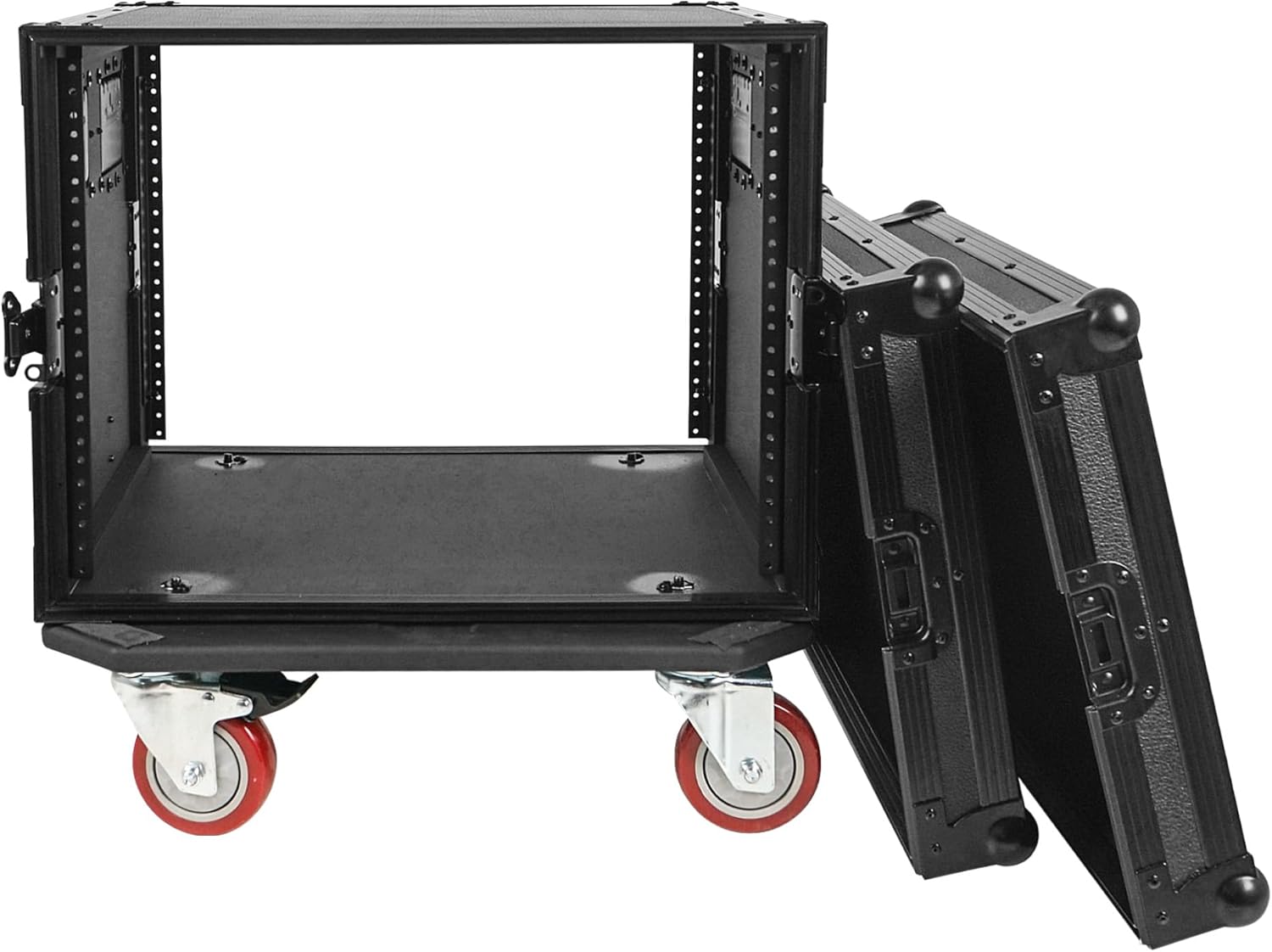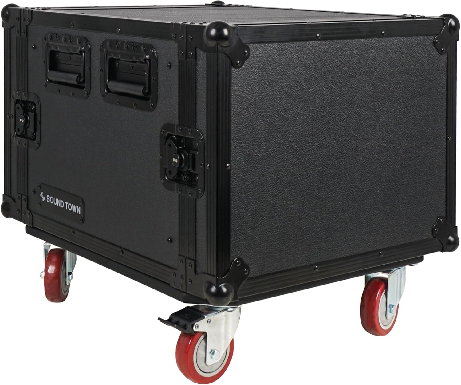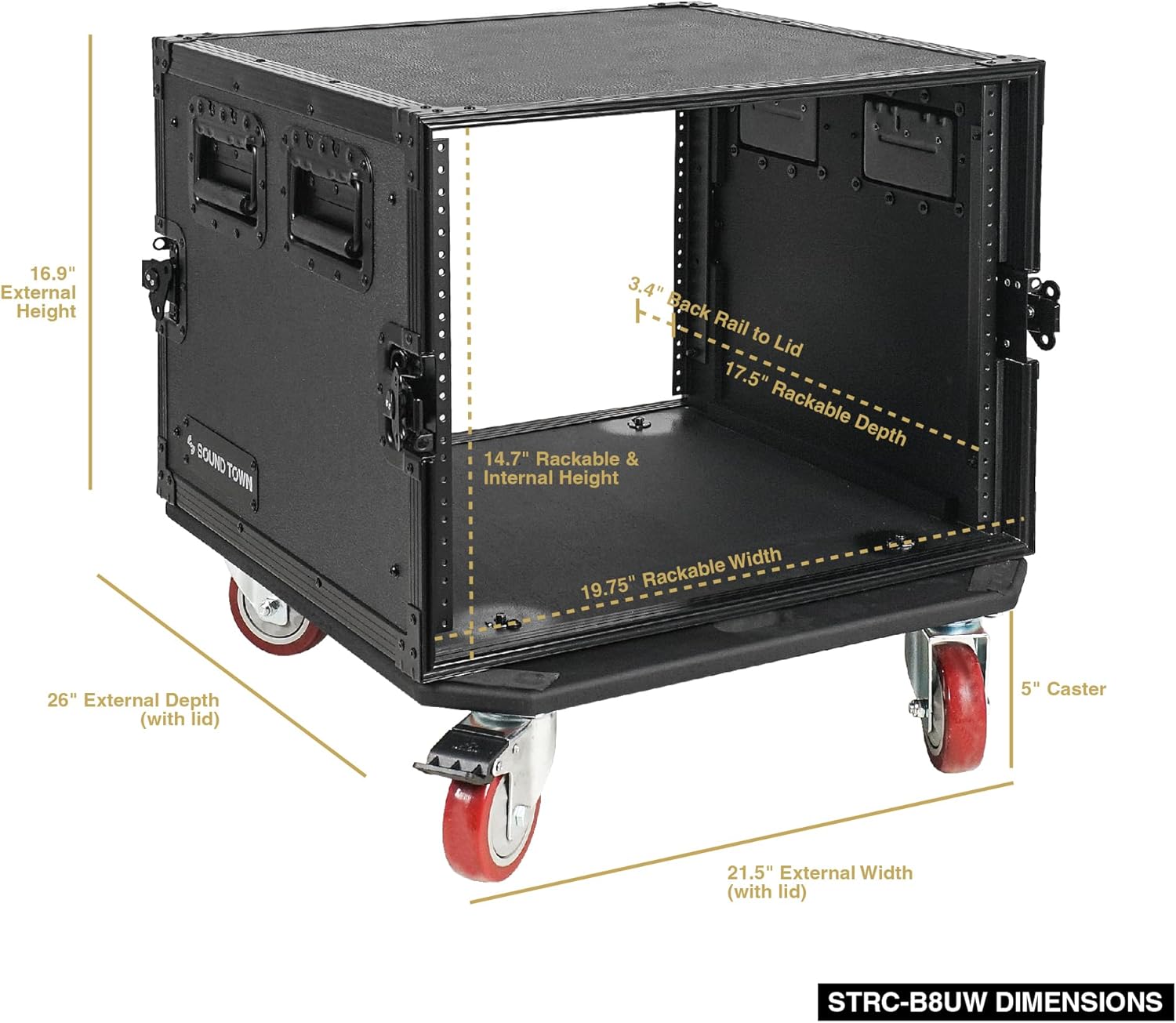 Sound Town Black Series 8U PA/DJ Rack/Road Case with 8-Space, All-Black Anodized Hardware, Plywood, Casters, and 21” Rackable Depth – Pro Tour Grade (STRC-B8UW)