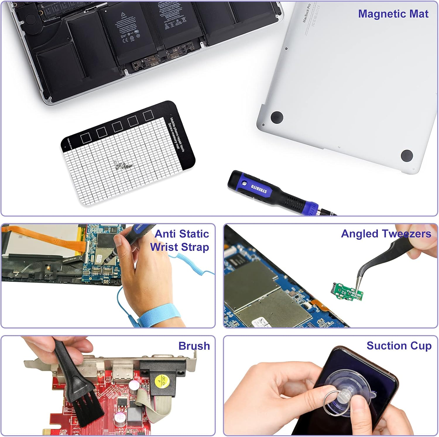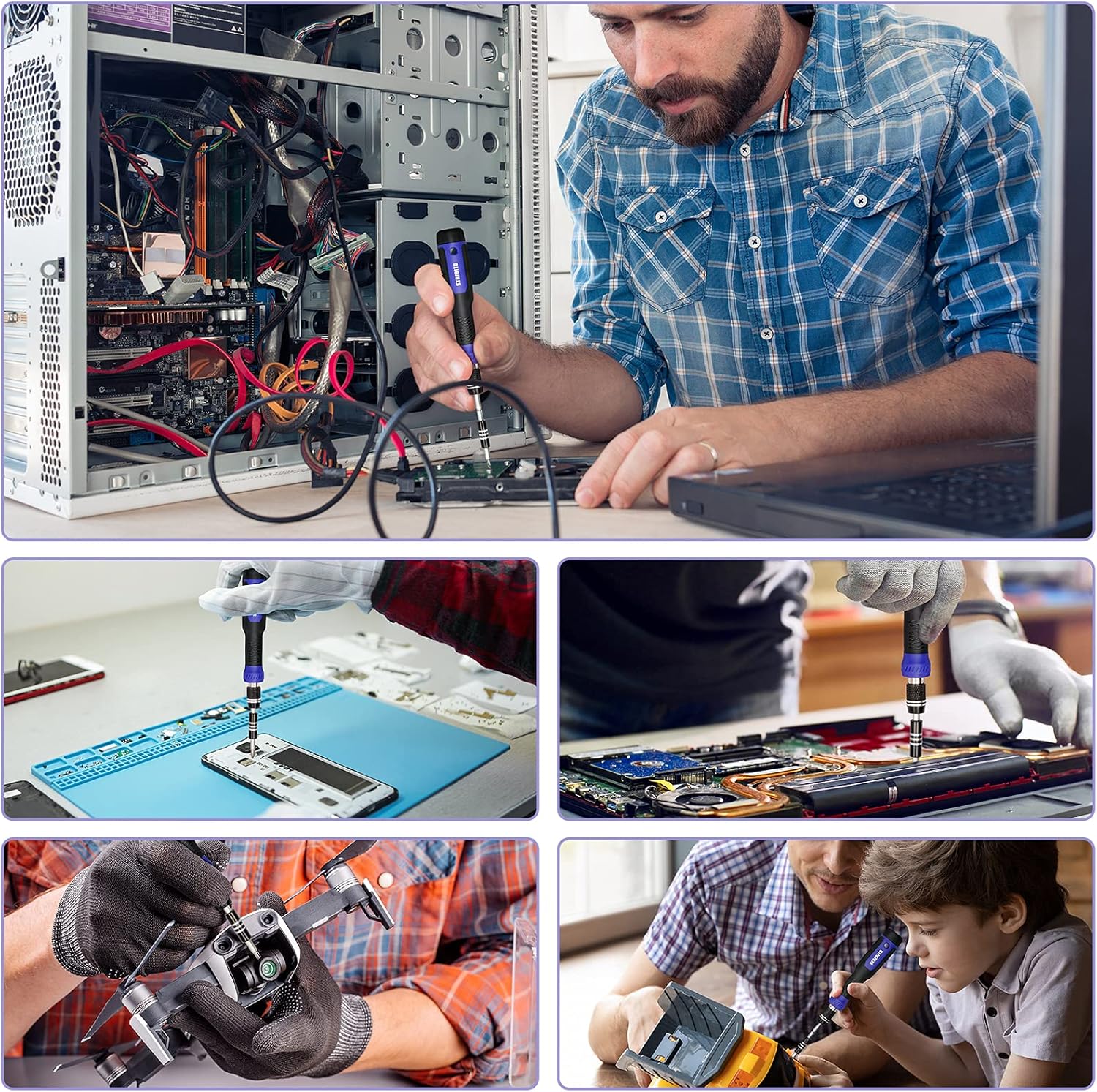 This screwdriver set is designed for use on a variety of devices including computers, iPhones, laptops, PCs, cell phones, PS4, Xbox, and Nintendo consoles.