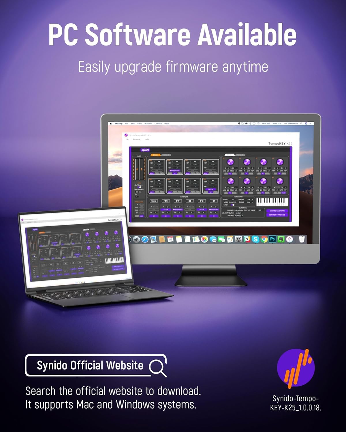 Synido 25 Key USB MIDI Keyboard Controller with Drum Pads, Professional Mini Midi Keyboard with OLED Screen, Beat Maker Machine for Music Production, Purple, TempoKEY K25