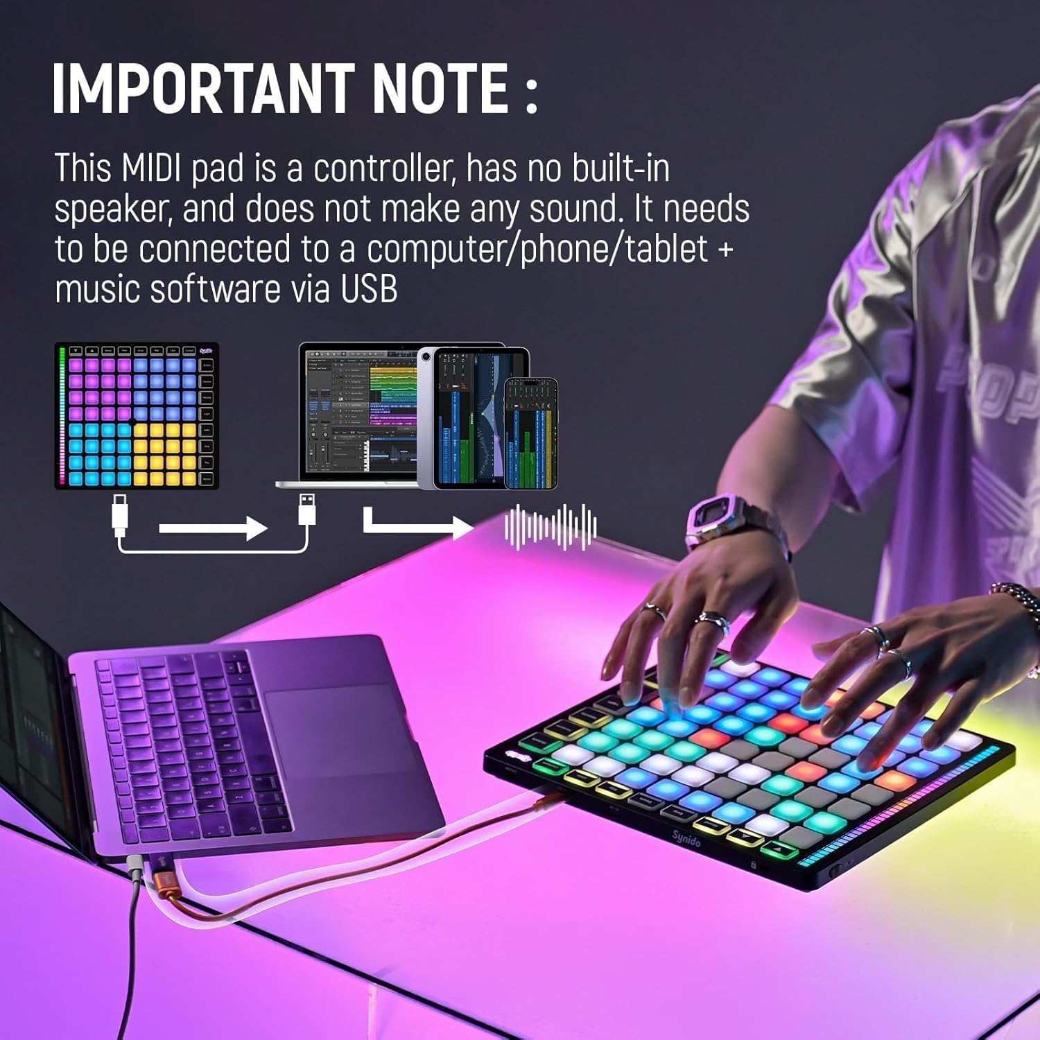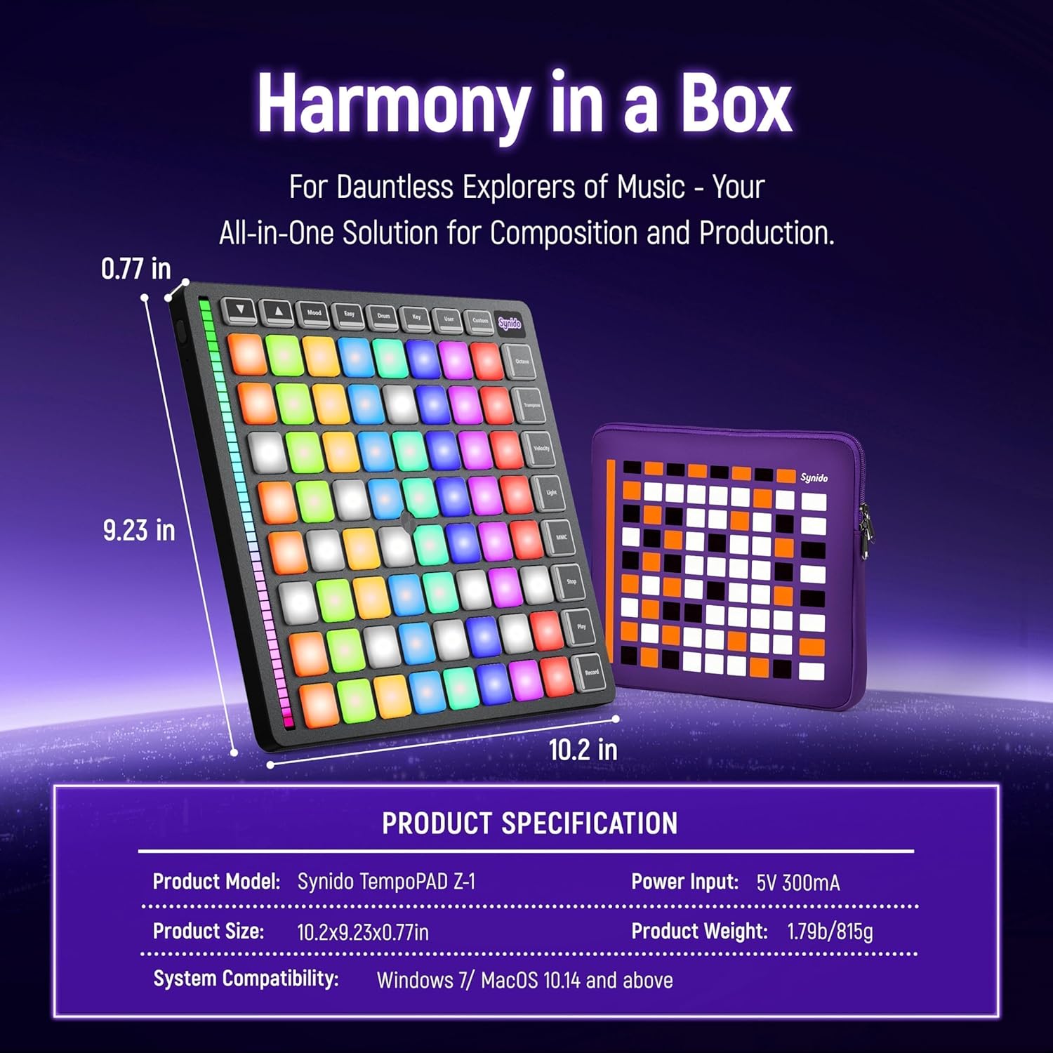 Synido MIDI Pad Beat Maker Machine with 64 Velocity Sensitive RGB Pads, Portable MIDI Controller 8 * 8 Backlit Beating Machine with Easy Mode for Music Production Beginners, TempoPAD Z-1