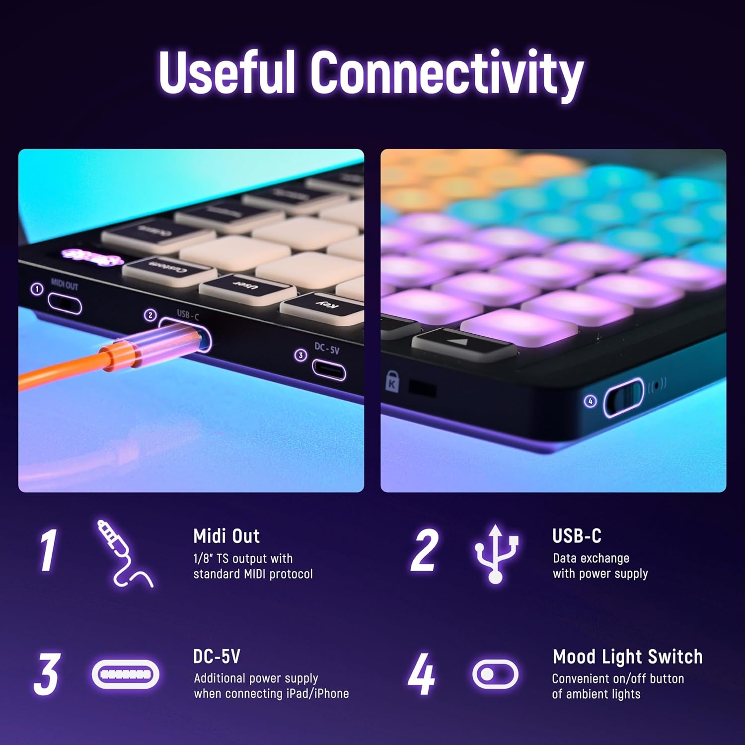 - Vibrant RGB pads enhance creativity