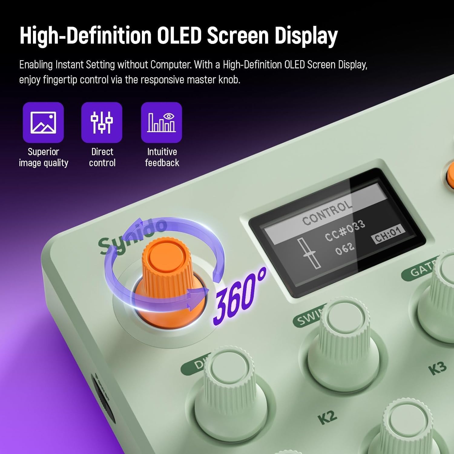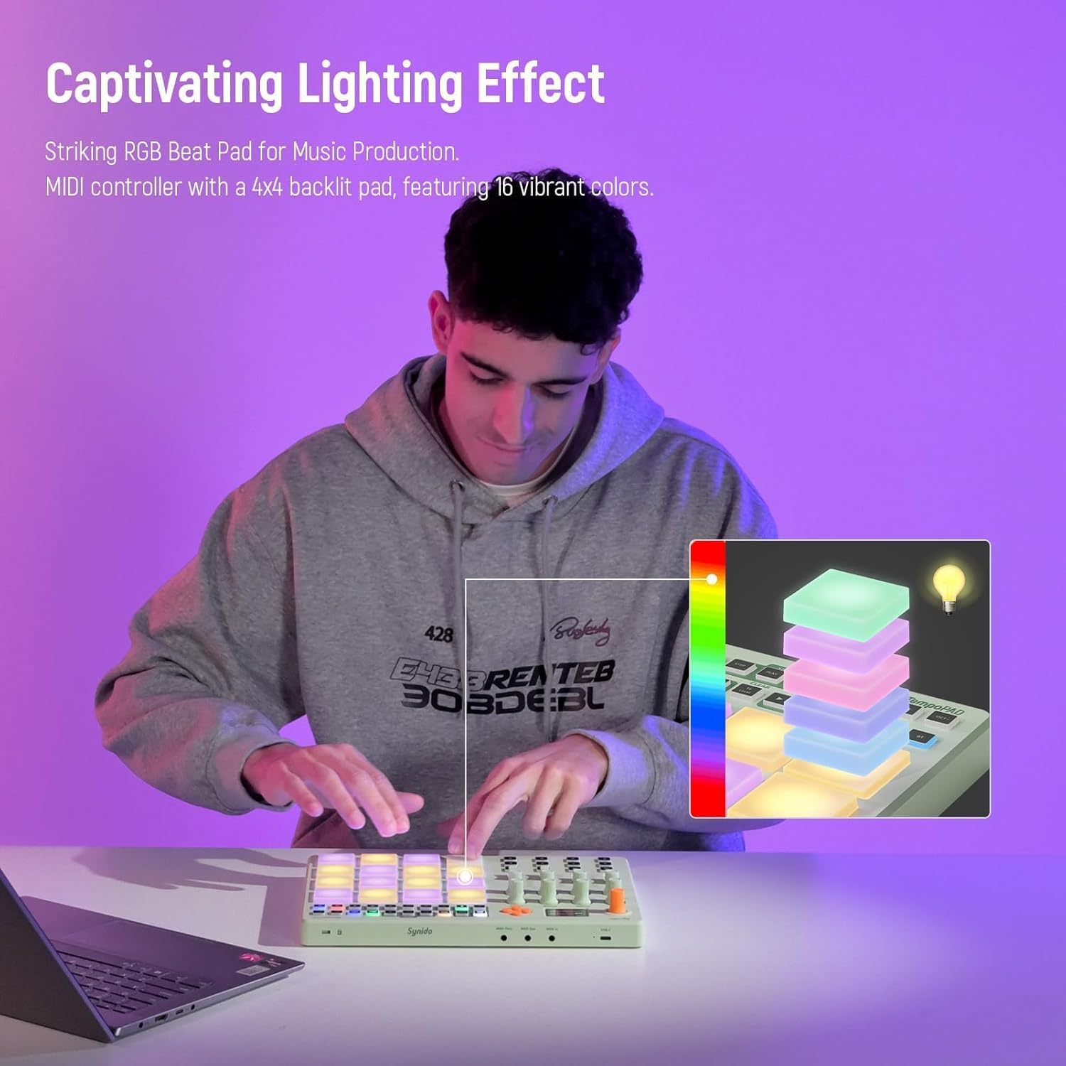 The Synido Wireless MIDI Pad Controller is designed for music production professionals. This USB rechargeable beat maker features 16 RGB beat pads that offer a vibrant and responsive interface for creating music. The OLED screen provides clear visibility of your settings and performance. Additionally, the 16 step sequencer allows for intricate beat programming, making it easier to compose complex rhythms.
