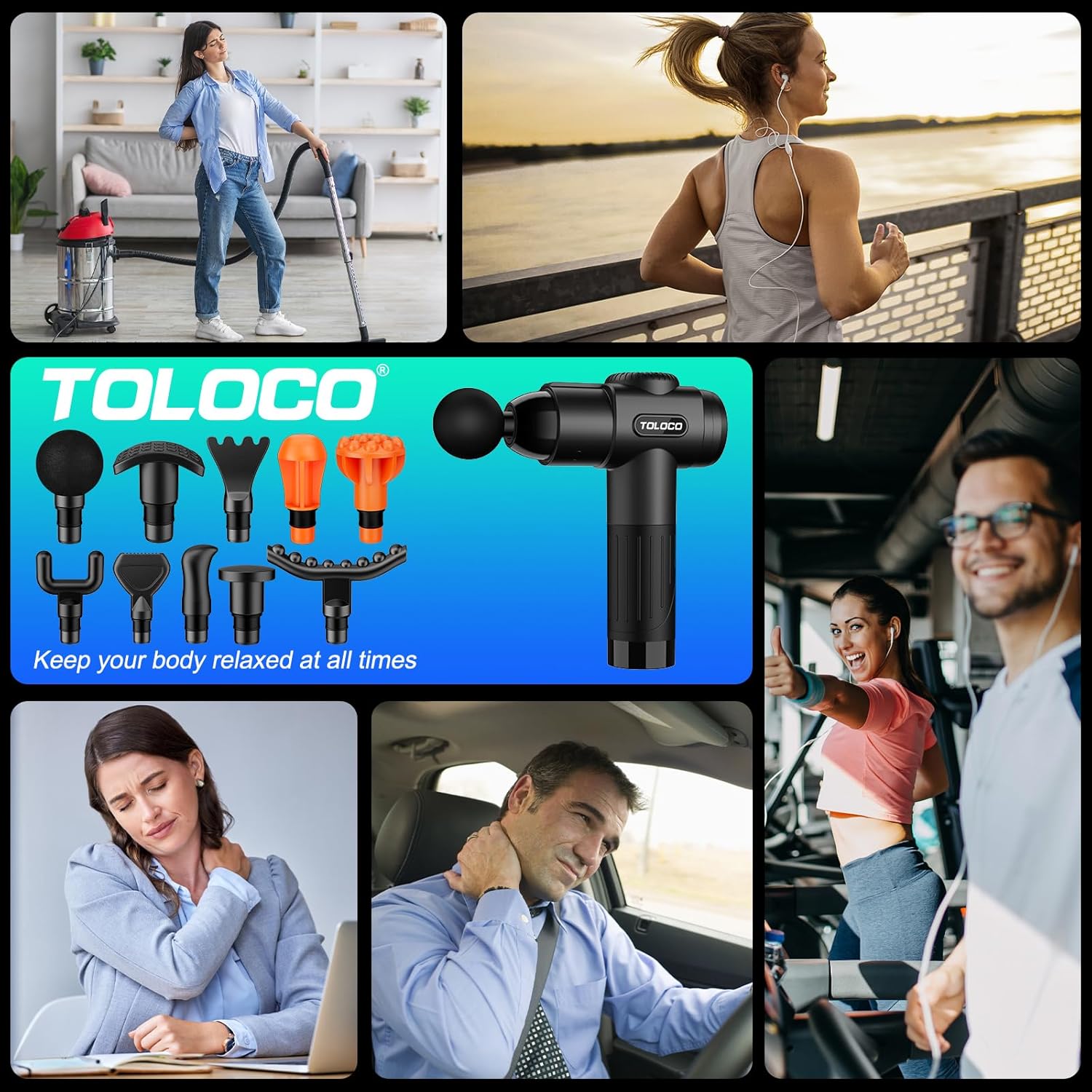 The TOLOCO Massage Gun is designed for deep tissue massage, making it an excellent choice for athletes and anyone seeking pain relief. With 10 massage heads, it offers versatile options for targeting different muscle groups. The silent brushless motor ensures a quiet experience, making it suitable for use at home, in the office, or while traveling.