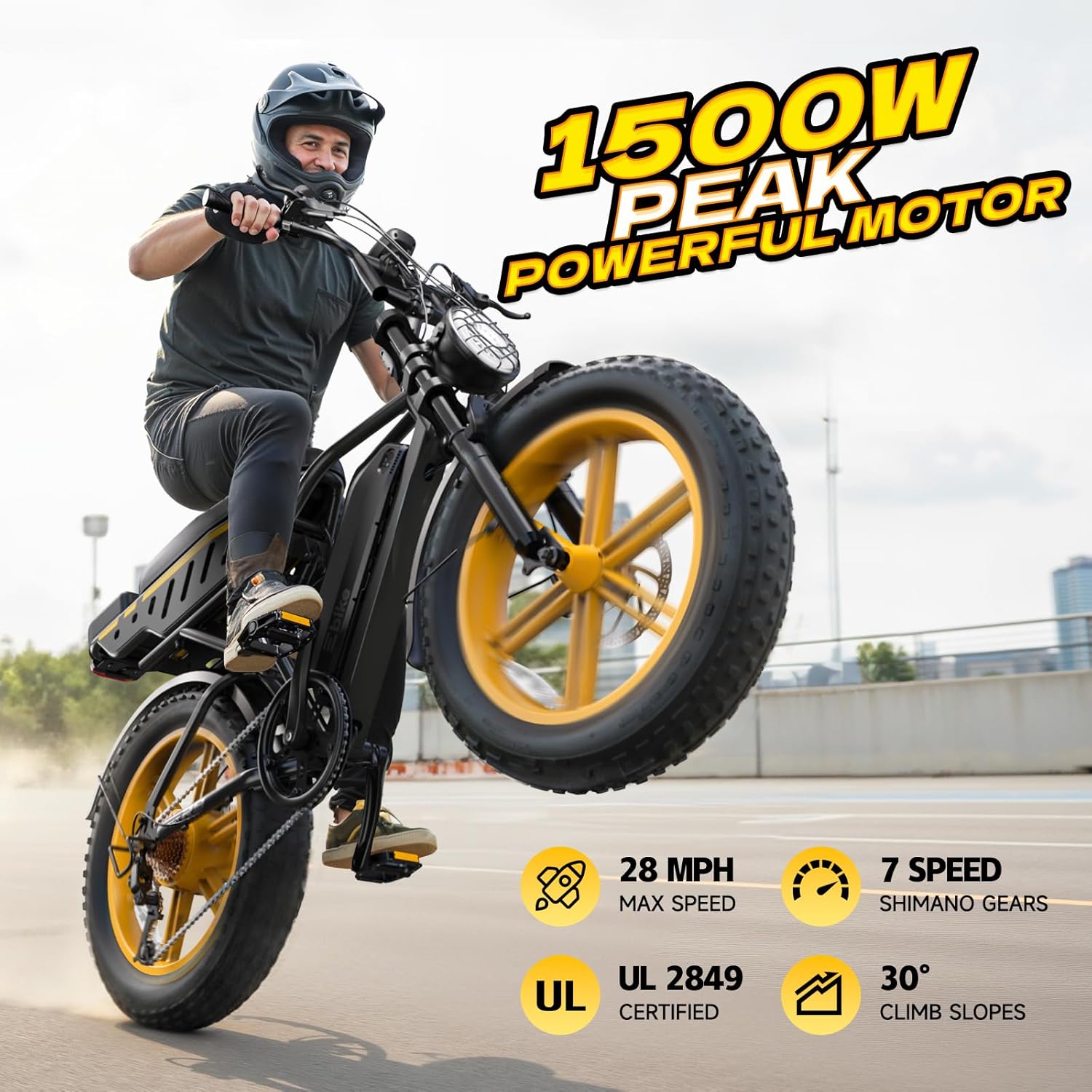 TST Electric Bike for Adults 1500W Peak 20″ Fat Tire All-Terrain E-Bike 60/130 Miles 28 MPH Electric Dirt Bike – 48V 15/30 AH Battery Tested to UL 2849 Powered Electric Bicycle