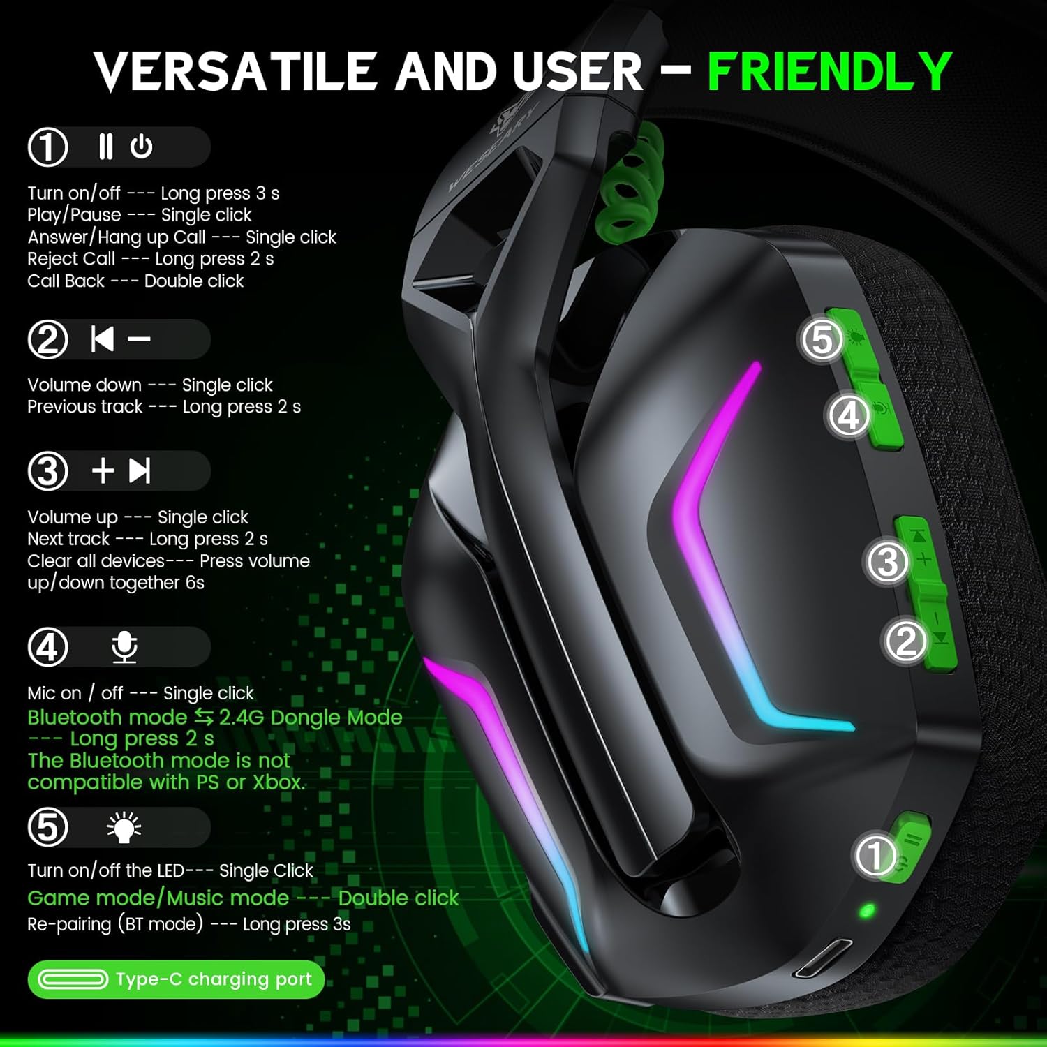 The WESEARY Wireless Gaming Headset is designed for gamers seeking an immersive audio experience. With 2.4GHz ultra-low latency, this headset ensures minimal delay during gameplay, making it ideal for competitive gaming. The noise-cancelling microphone allows for clear communication with teammates, while the 3D surround sound enhances your overall gaming experience.