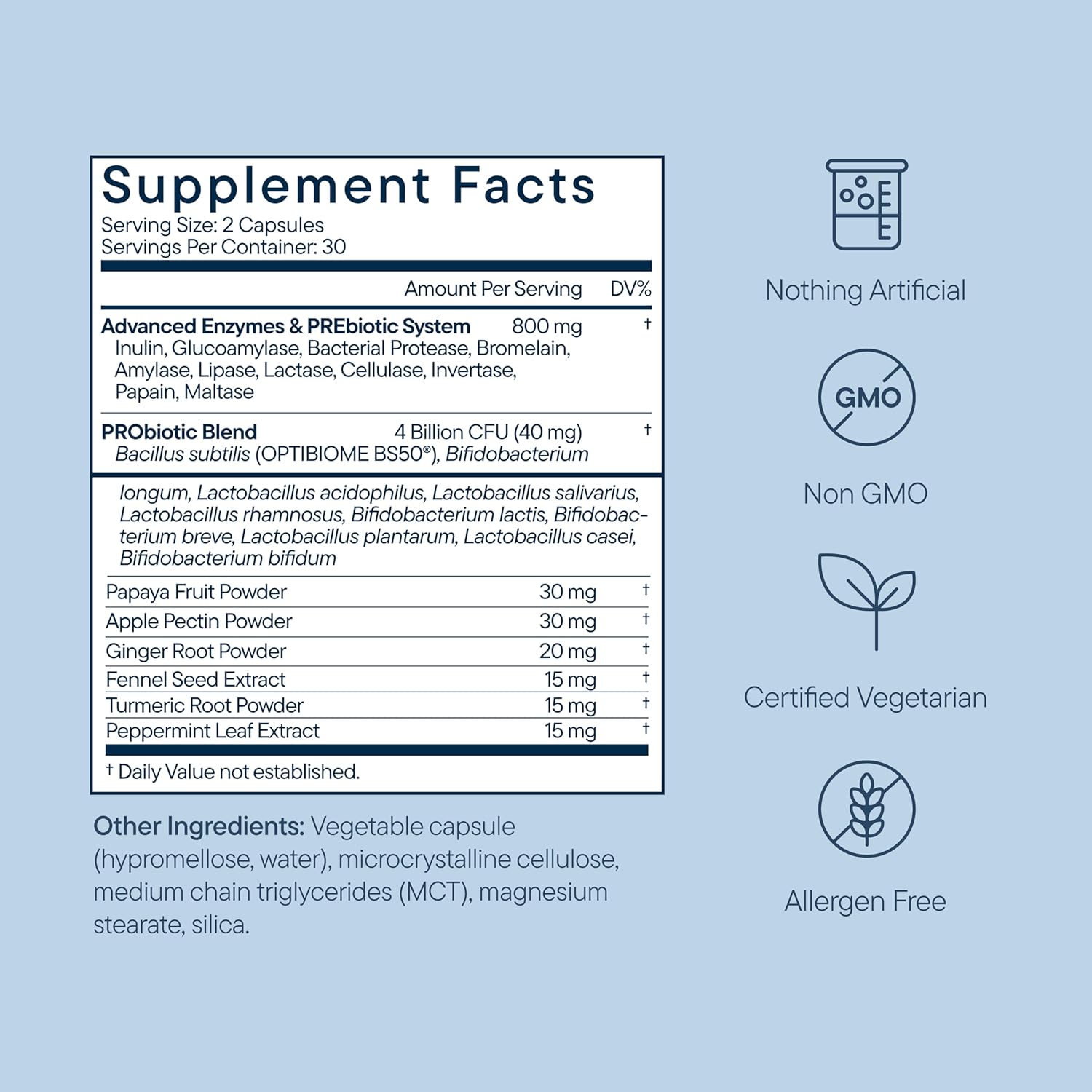 The main ingredients include bromelain, papaya, probiotics, and prebiotics.